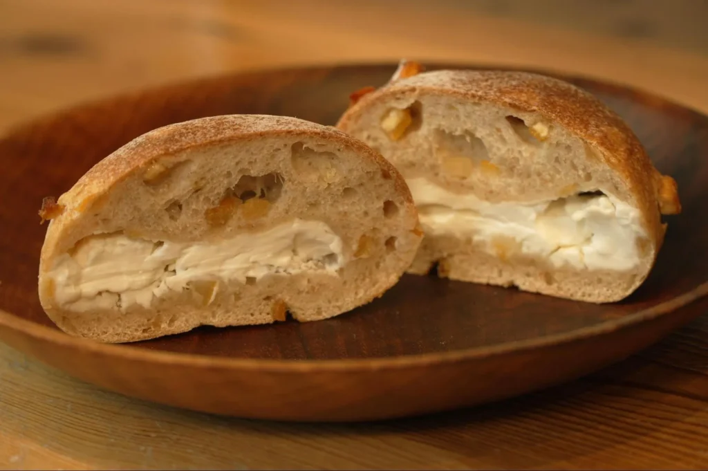 カンパーニュの生地はそのままに、中にオレンジピール、レモンピール、そして、たっぷりのクリームチーズを入れた女性人気の高いパン。