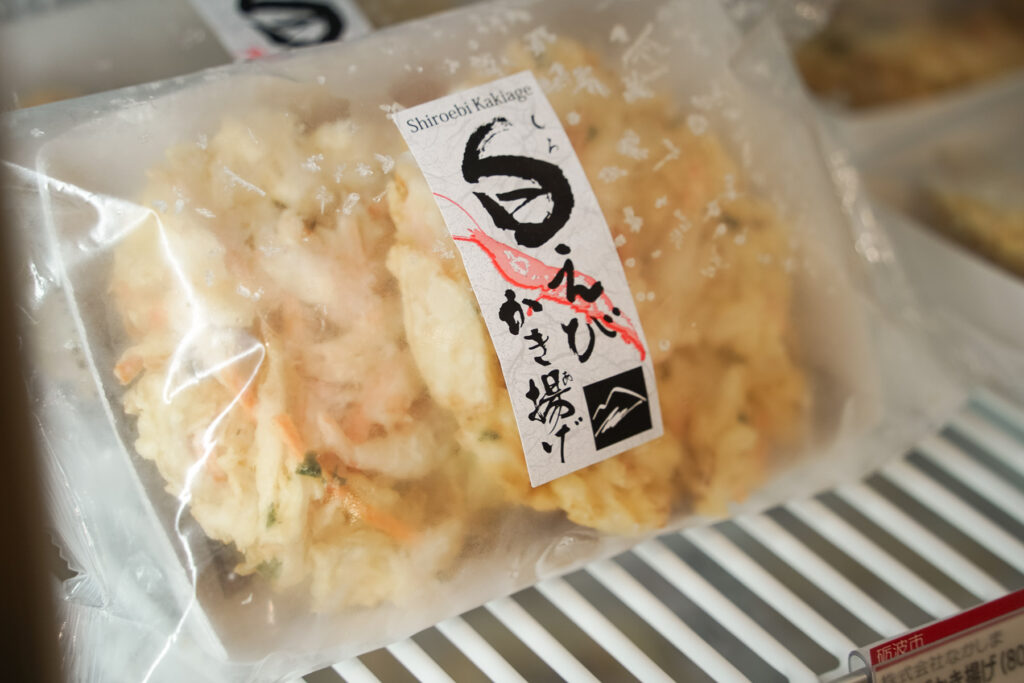 富山湾の宝石と呼ばれる「白えび」と、玉ねぎ、にんじん、小松菜をベースにしたかき揚げです。