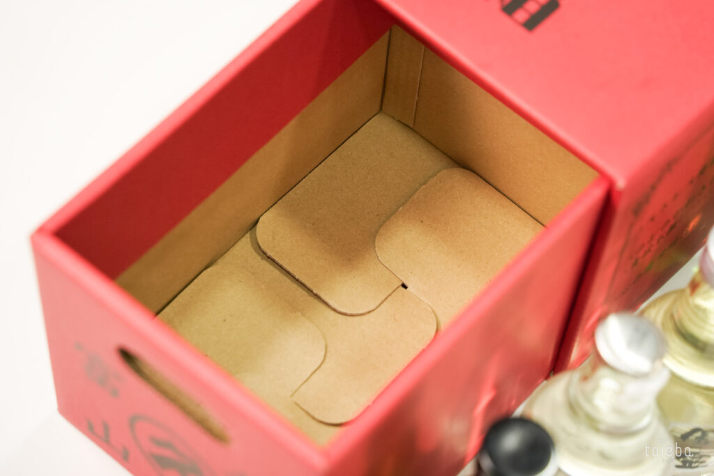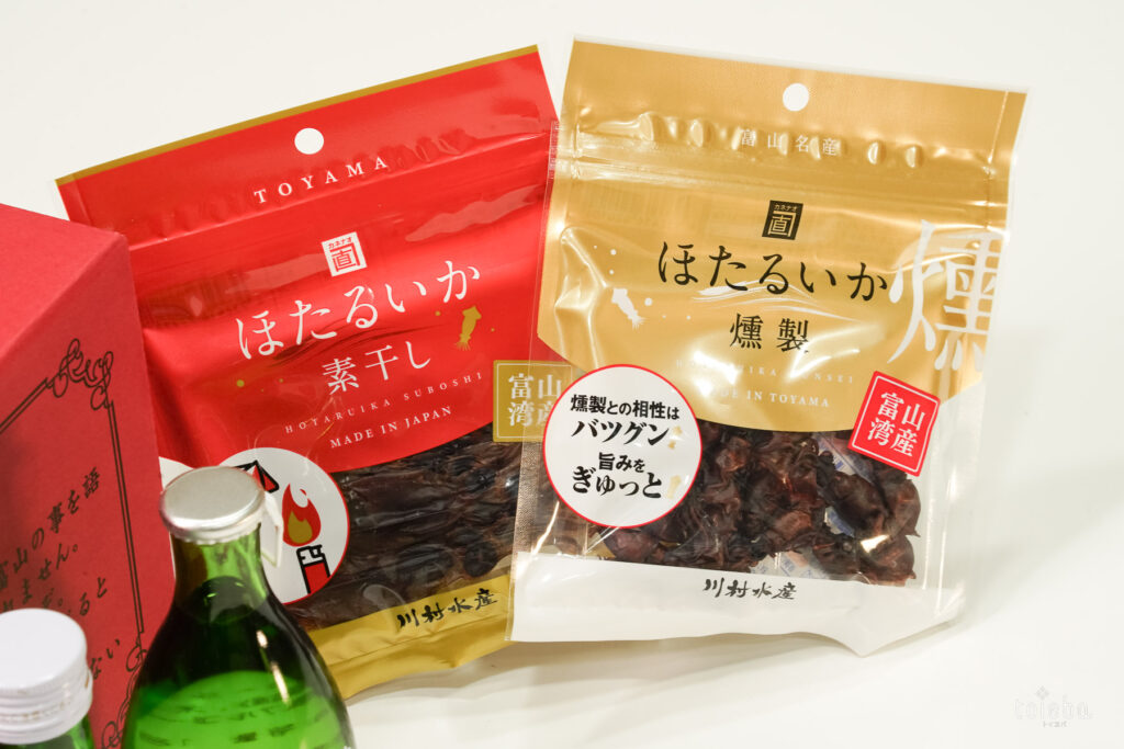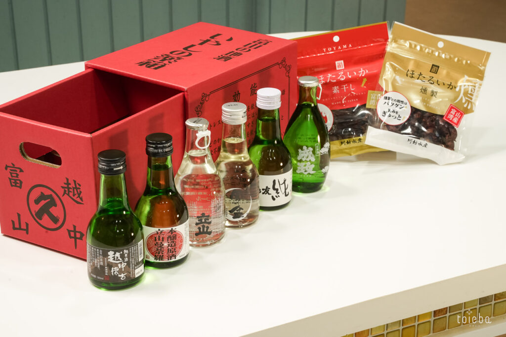 「いやしの薬箱(酒)ほたるいかセット」はととやまオリジナルセット。富山の置き薬でお馴染みの赤い薬箱に、富山の地酒6種とほたるいかの燻製、素干しが詰められています。