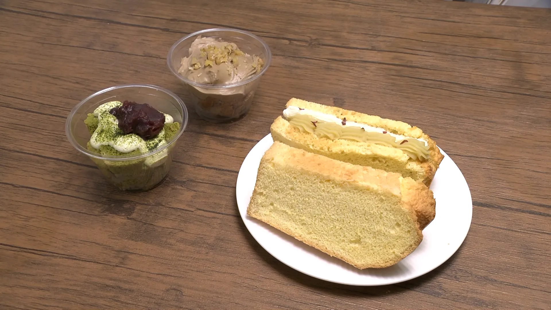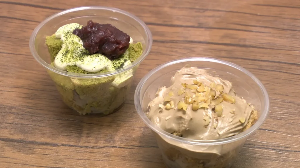 左:抹茶カップシフォン 右:ほうじ茶クリームカップシフォン 各320円(税込)