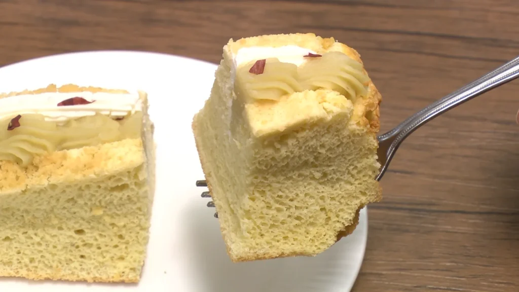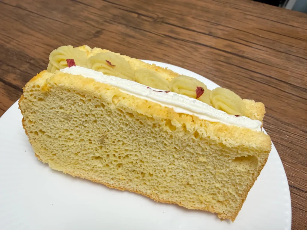 さつまいもを混ぜて焼き上げたしっとりのシフォンケーキに、おいものペーストとクリームの濃厚な甘みが溶け合い、ひとつでも満足感のある贅沢な一品です。