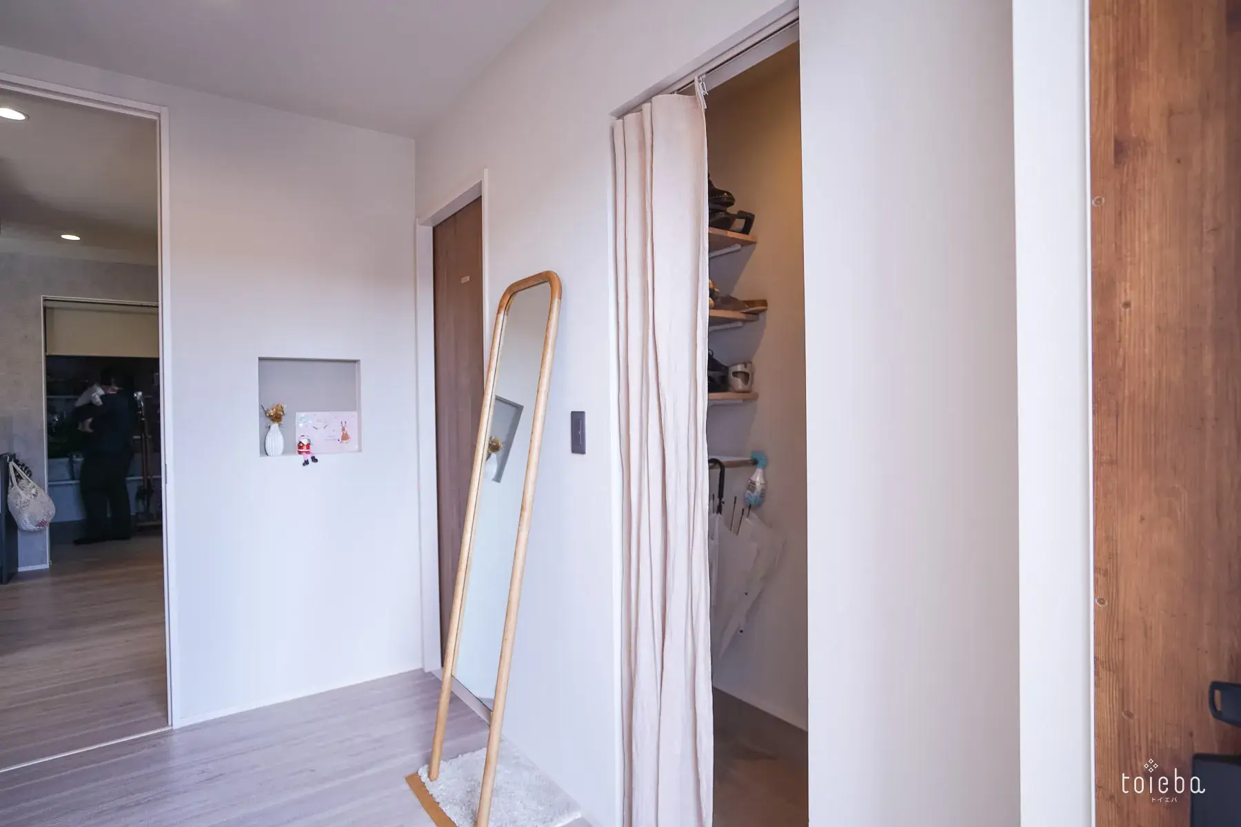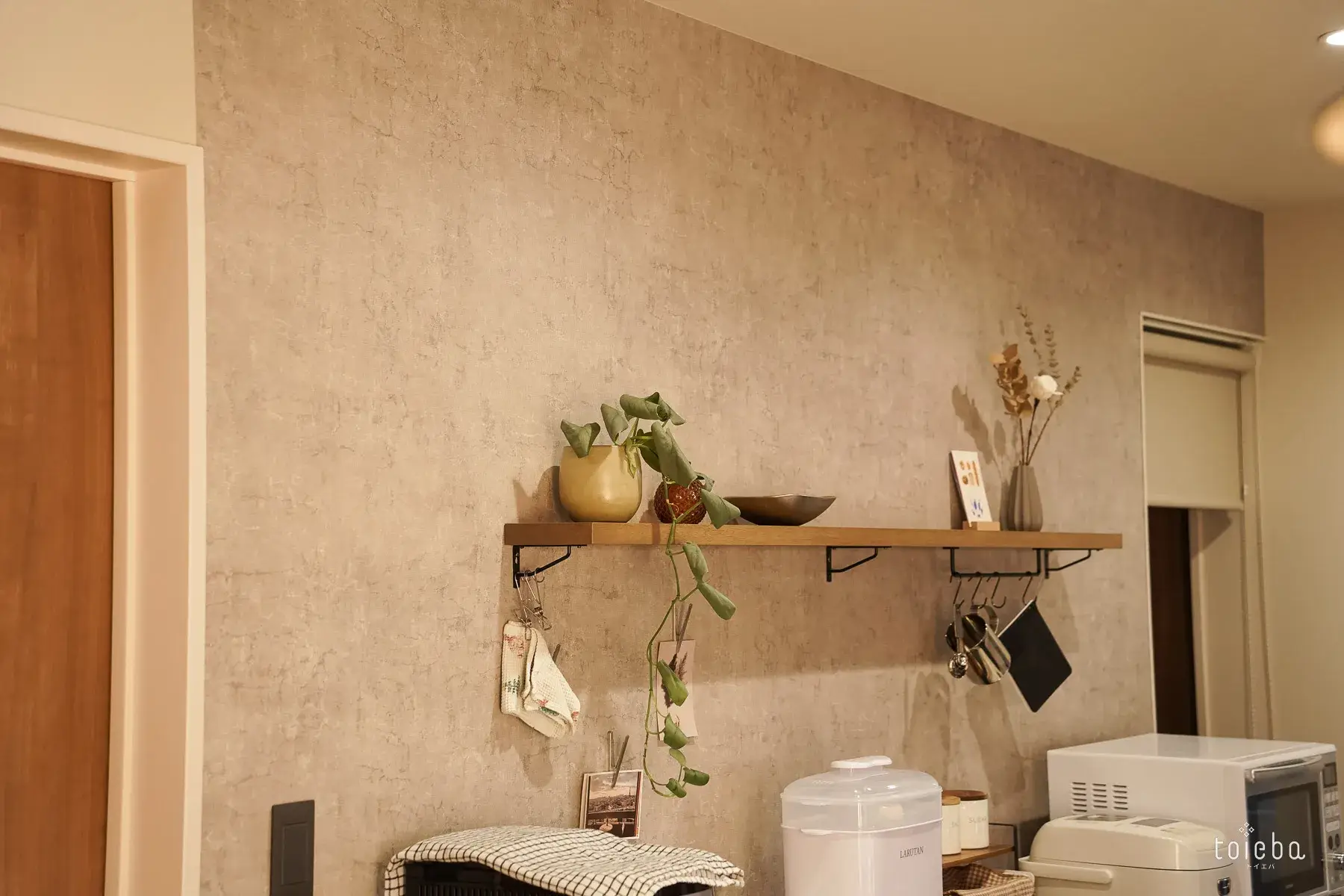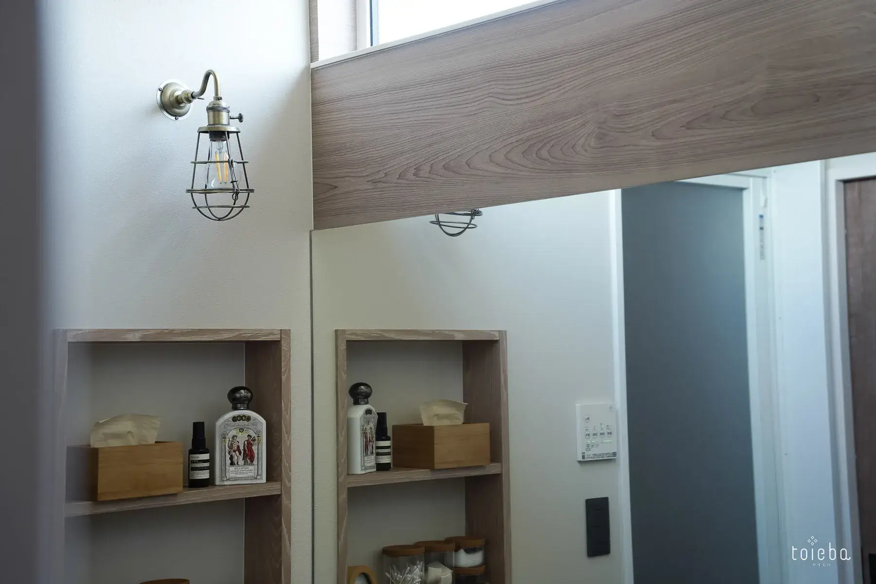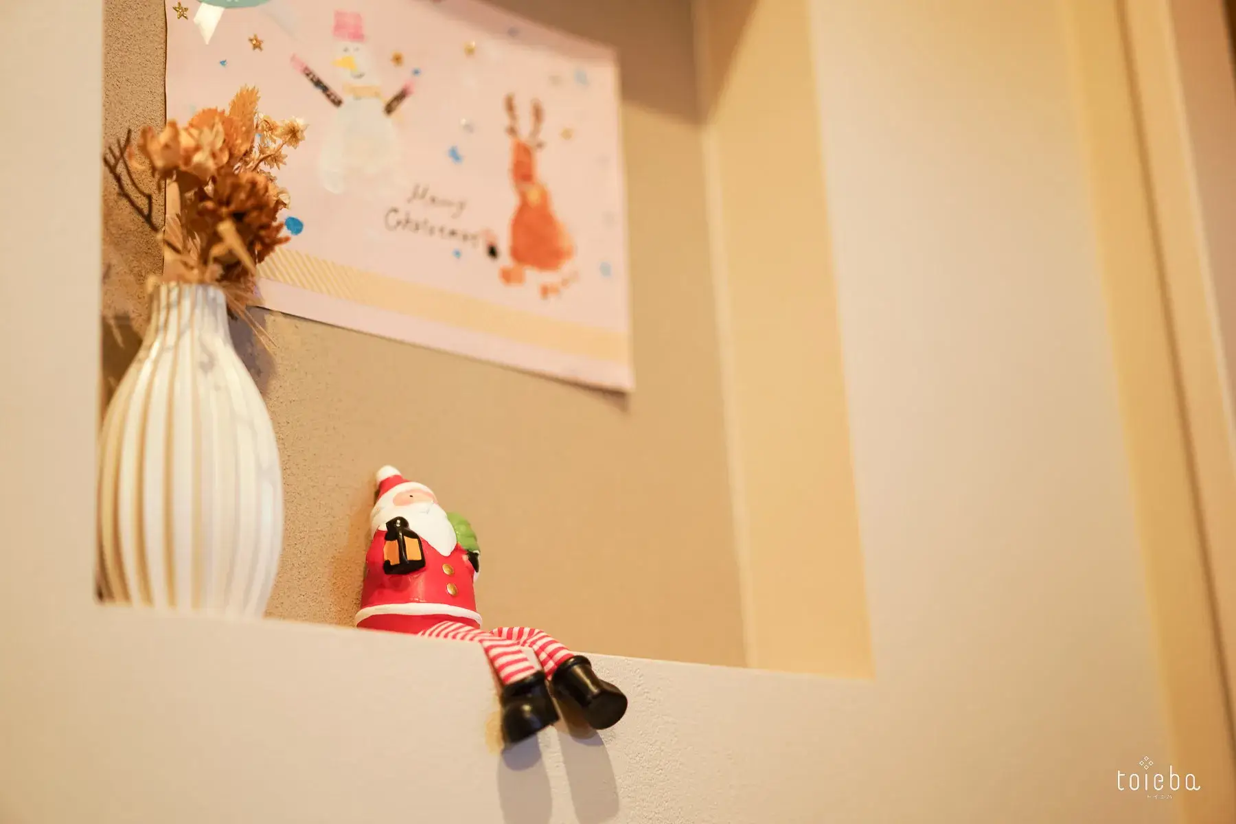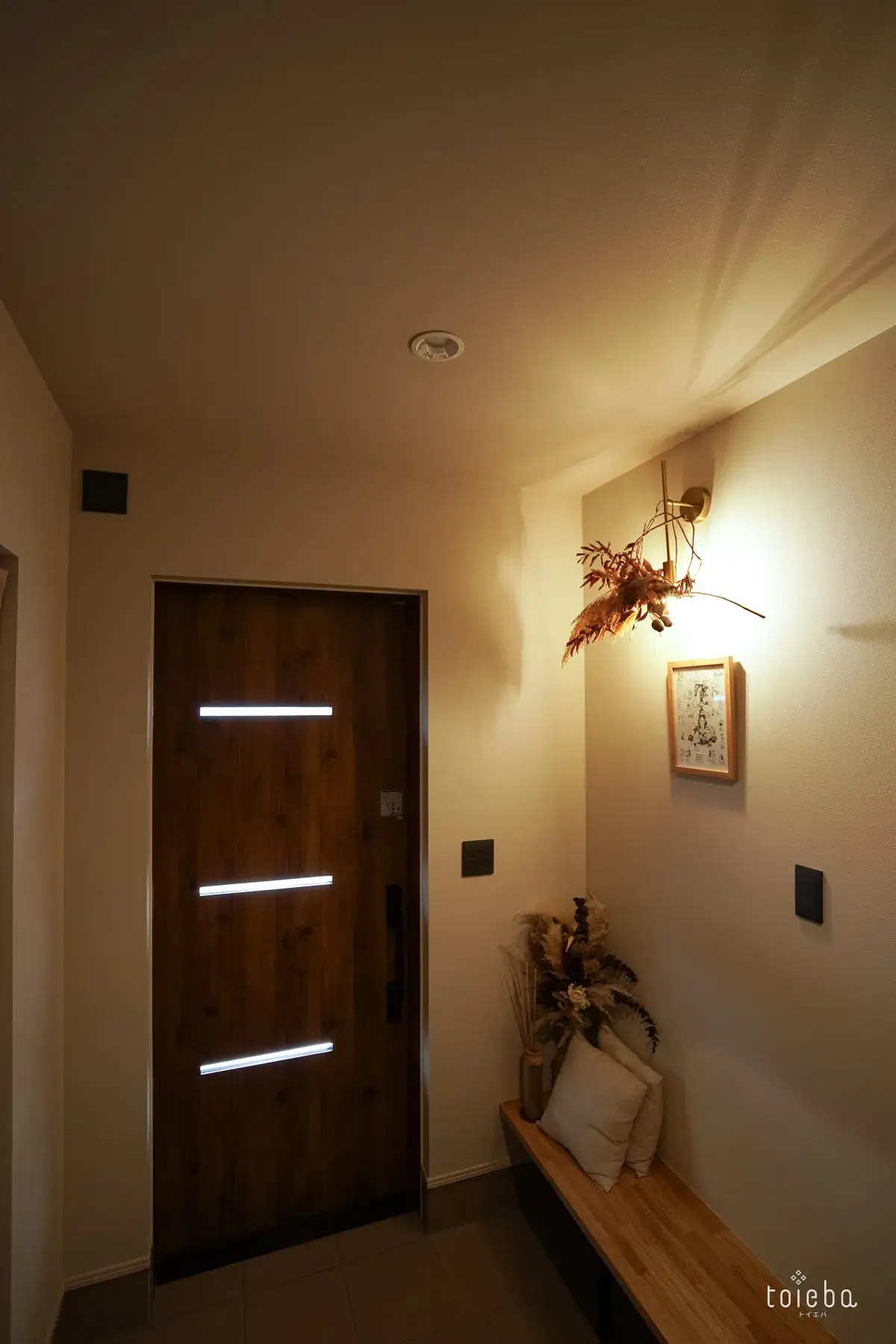 壁には真鍮のライトにドライフラワーを飾ることで影ができ、よりおしゃれな雰囲気に。ニッチには季節ものを飾るなど、奥様のセンスが光ります。