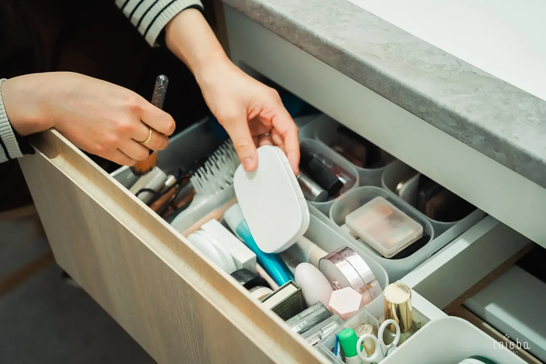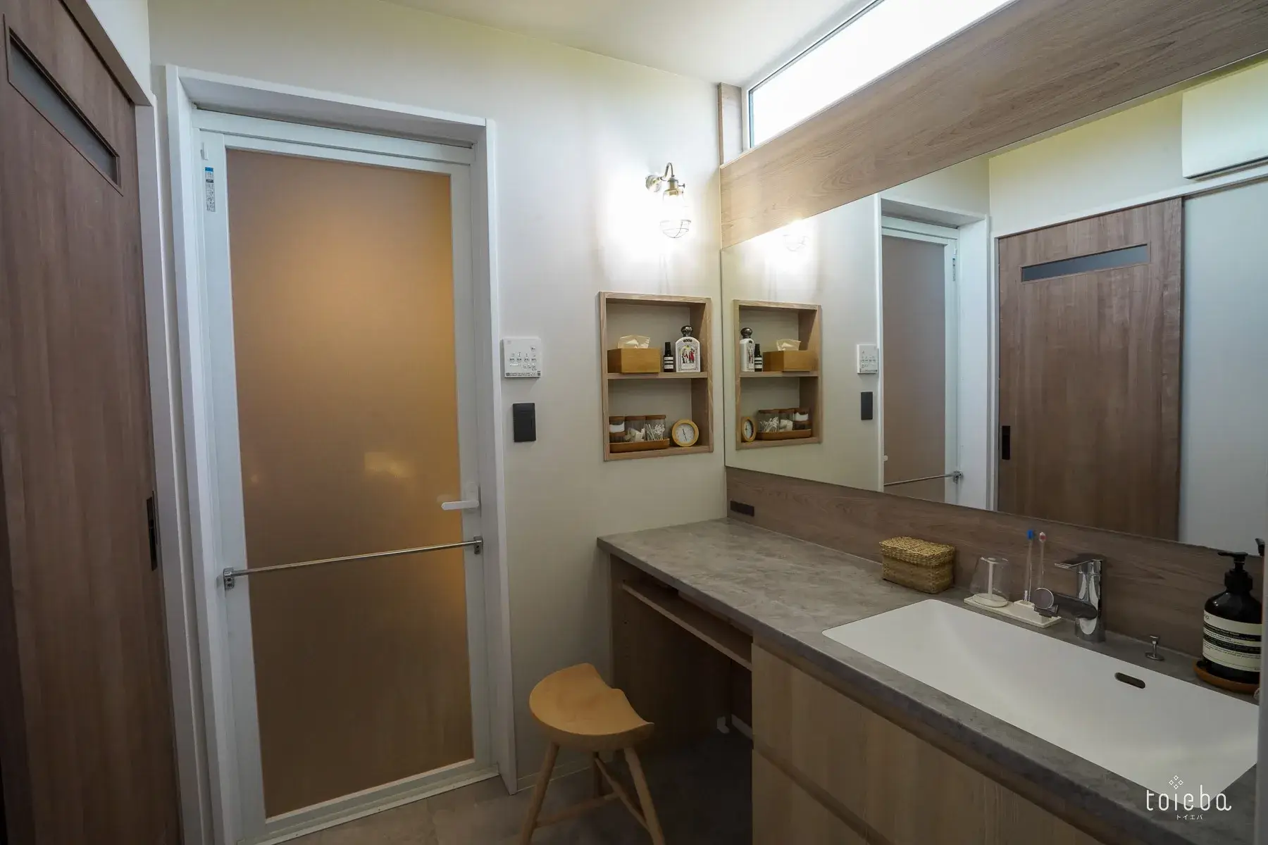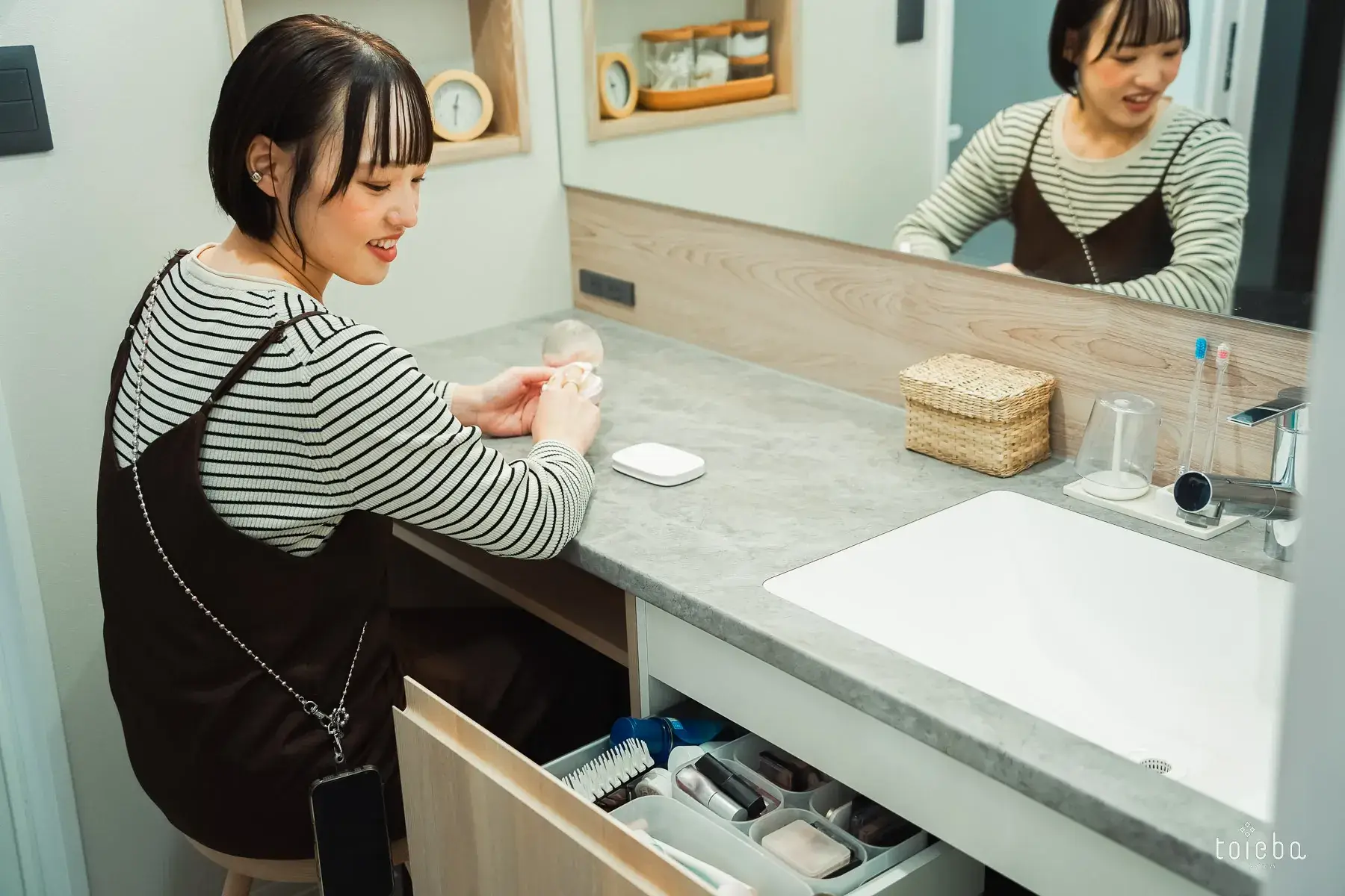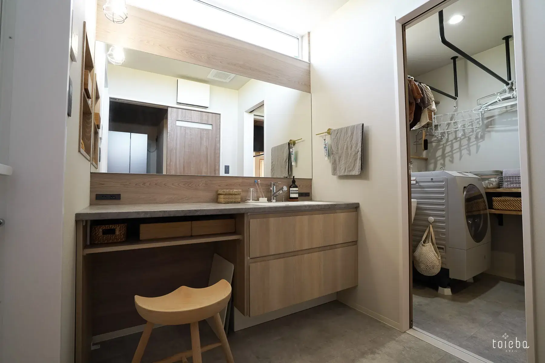 水回りは家事が楽になるように、サンルーム・洗面・お風呂が一直線に並んでいます。洗面には奥様がゆっくりお化粧できるようにスツールを置き、収納の引き出し内にはメイク用品がさらに小分けのボックスを使ってきれいに整理されています。