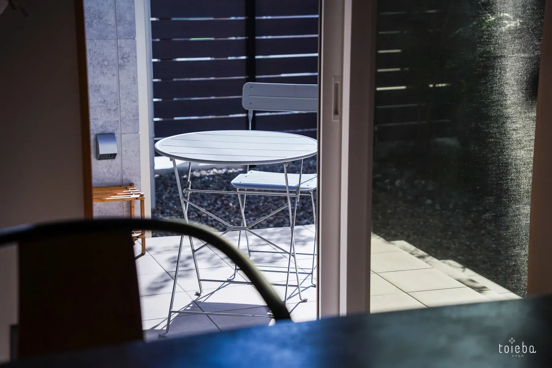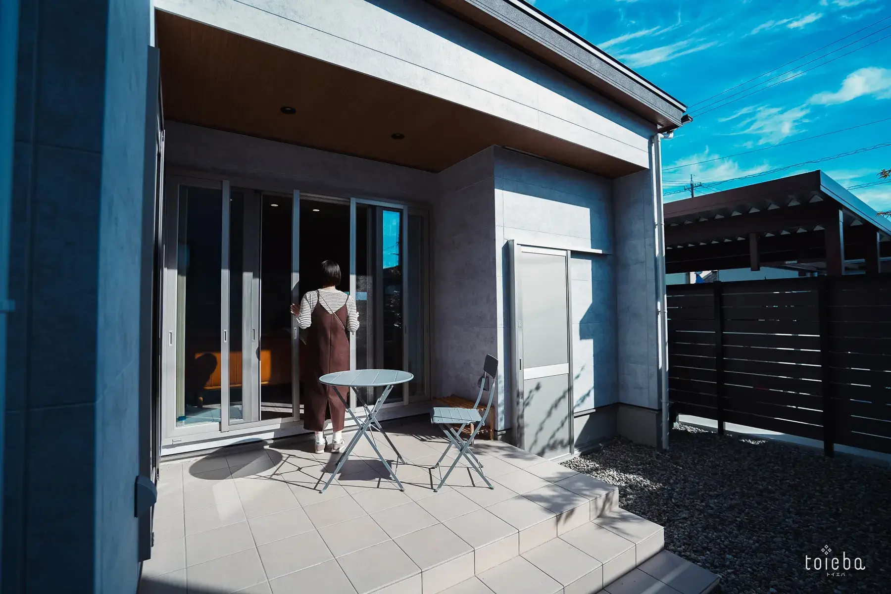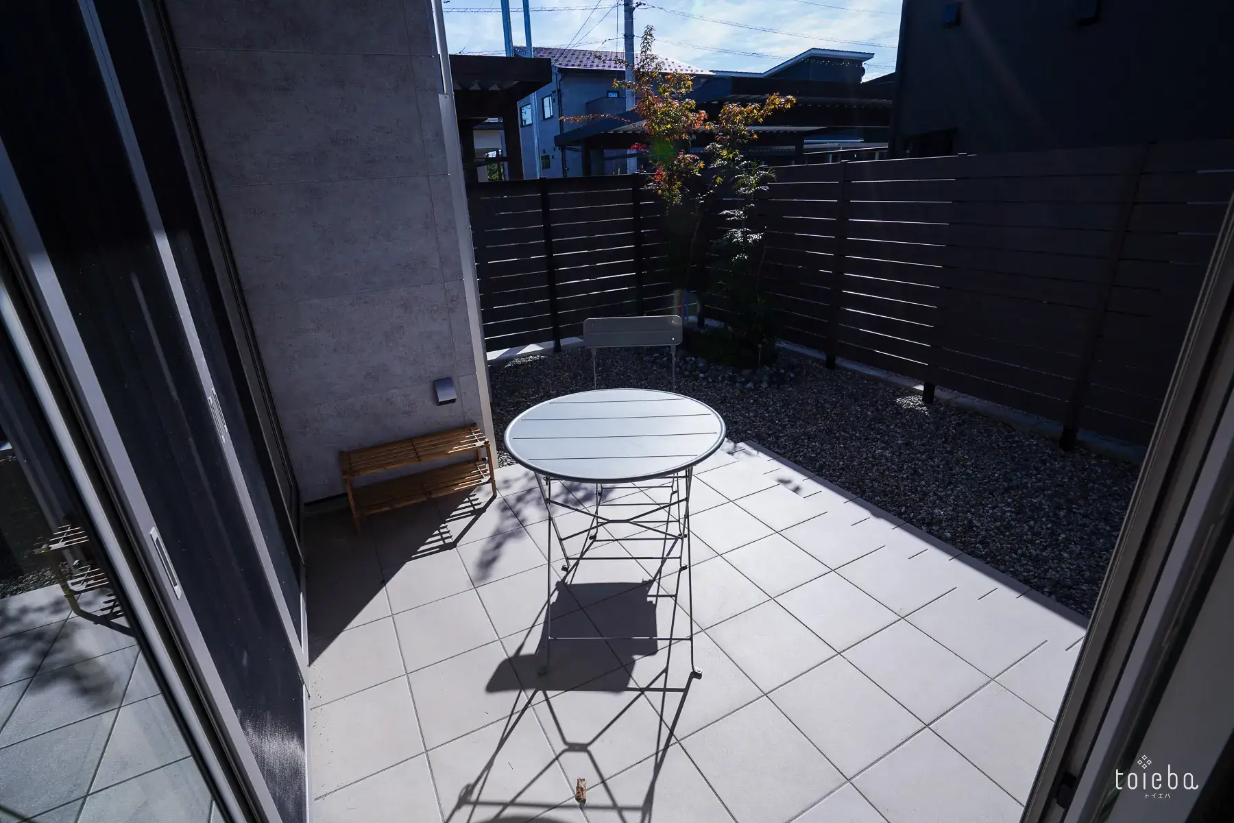 中庭テラスは外からの視線を遮る設計に。バーベキューも周囲の視線を気にせず楽しめます。外部収納には、バーベキューセットや雪かき用の道具なども収納しています。