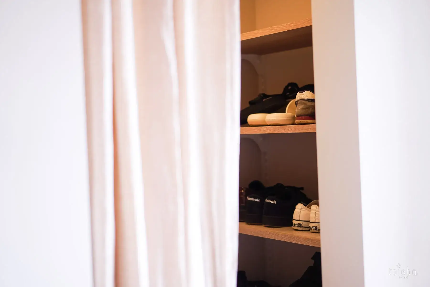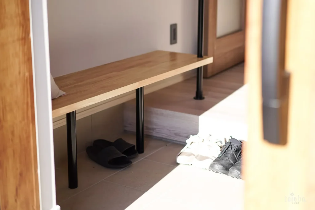 玄関には、営業担当の方におすすめされて採用した「造作ベンチ」が。高さにもこだわりました。靴の脱ぎ履きがラクになり、買い物帰りに重い荷物を置くこともできます。