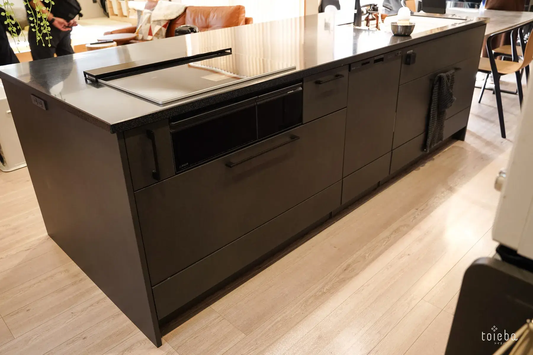 料理が好き!なご主人の好みで黒を基調にまとめたアイランドキッチンは、Kさん邸の“主役”ともいえる存在。背面の壁はマグネット仕様になっており、写真やお知らせを貼っておける便利さも◎