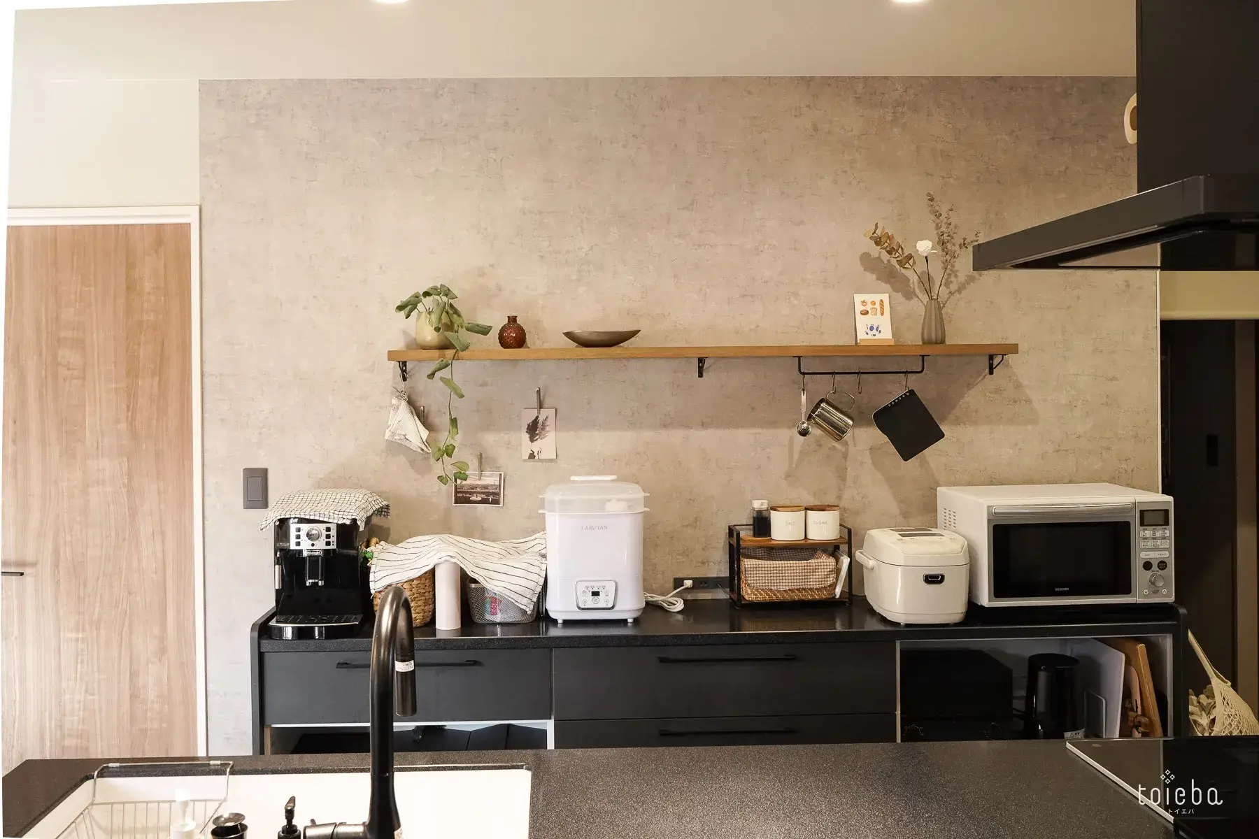 キッチンの壁は、ご主人が選んだ黒のアイランドキッチンに合わせてグレーに。リビングのソファや小上がりへ向かうにつれて、奥様の好みであるベージュへと、だんだん明るくグラデーションになっており、空間全体に自然な流れと温かみを生み出しています。