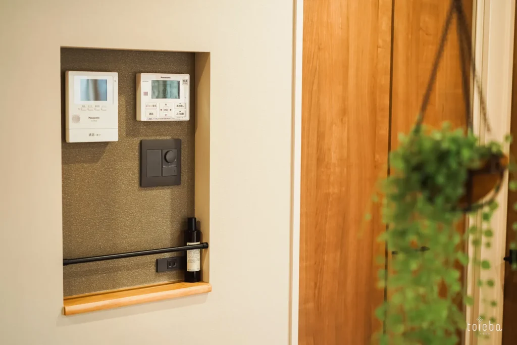リビングにはインターホンや照明用のニッチがあり、届いた郵送物を置くことができるように棒も設置して工夫しています。