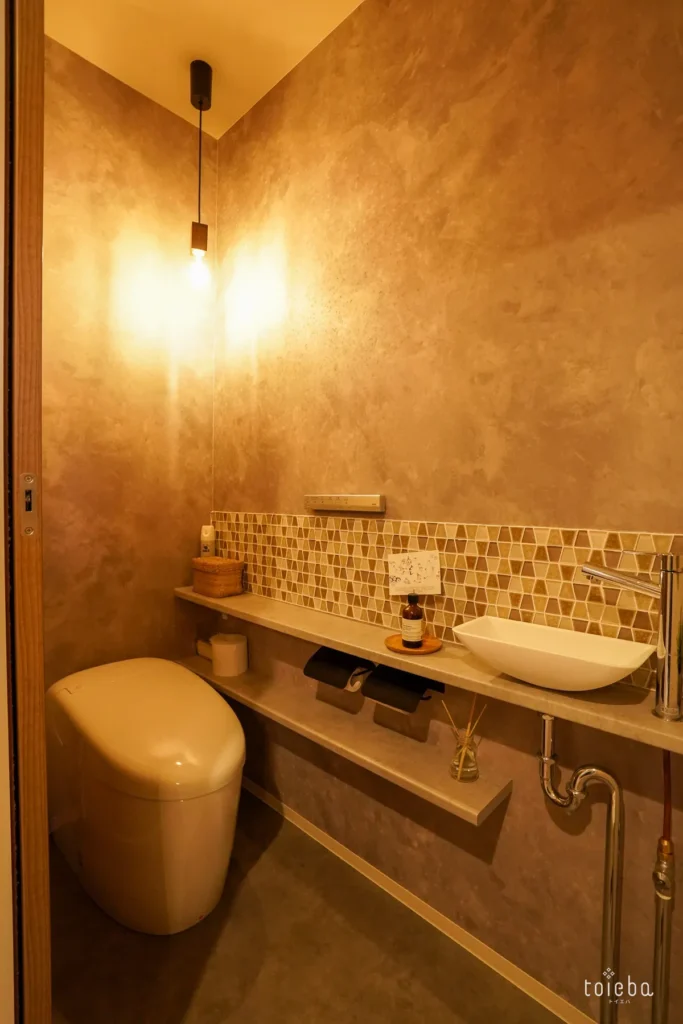 奥様の一番のお気に入りは、内装にとことんこだわったトイレだそう。もやもやっとしたグレーの壁にベージュのタイルが映え、ペンダントライトで照らされるとおしゃれなカフェのよう!