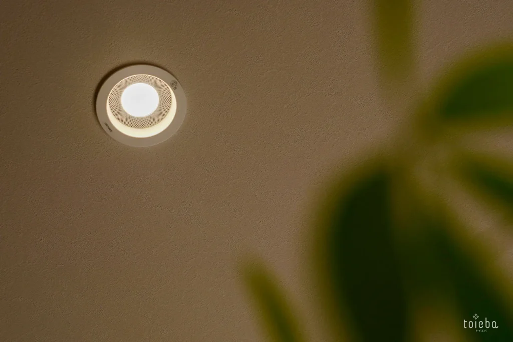 毛利さんが「玄関に設置したベンチが便利だった」と教えてくださって、実際に毛利さんの家のベンチにも座らせてもらったんです!実際に座ってみて、自分たちに合う高さに調整することができました。リビングのダウンライトを一部スピーカー付にするアイディアも採用しました!