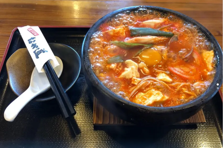 特に土日祝日限定の「豆腐チゲ鍋焼きうどん」は人気の激辛メニューです。実際に韓国まで足を運んで味を研究した店長のこだわりが詰まった一杯で、豚肉やアサリ、豆腐、白菜キムチなどの具材がたっぷり入っています。熱々で提供されるスープは辛さがしっかり効いており、食べると自然に汗が出るほどです。