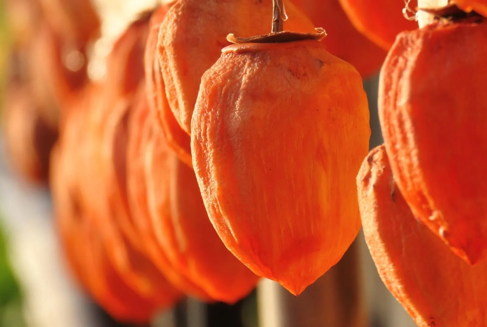 収穫した三社柿はまず皮をむき、主に酸化やカビを防ぐためにいぶして蒸します。その後、竹の棒と糸でへたの部分をしばり、柿を乾燥させます。乾燥は天日や機械を使いながら、渋みが抜けるまで約20〜25日間かけて乾燥させるのがポイントです。