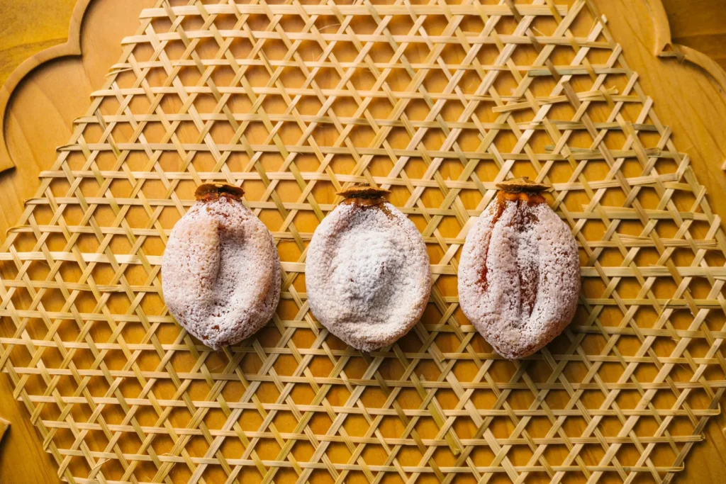 ある程度水分が抜けた段階で、職人がひとつずつ手でもみ、硬さが均等になるよう整えます。丁寧な手もみのおかげで、柿の内部まで甘みがじんわりと行き渡ります。手もみは柿の状態を見極めながら工程を進めるため、経験のある職人の勘が欠かせません。