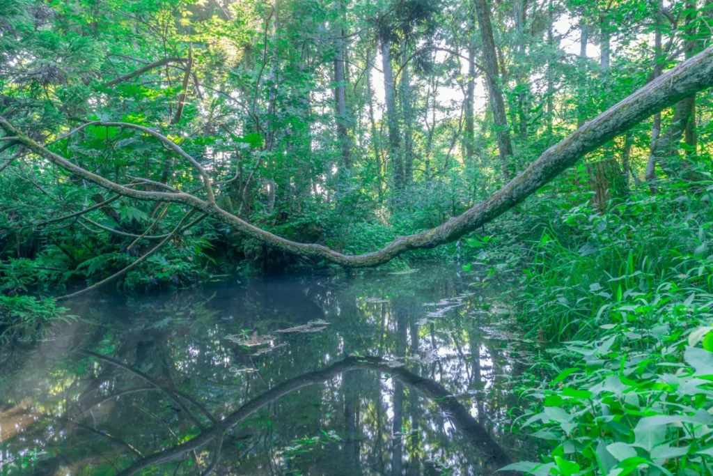 林の中に一歩足を踏み入れれば、雪の重みで曲がった枝から新たな根が伸びる「伏条現象(ふくじょうげんしょう)」を目の当たりにできます。地下水の影響で冬でも暖かいため、寒冷地では珍しい植物や、シダ類が共存する独特の生態系も見どころです。