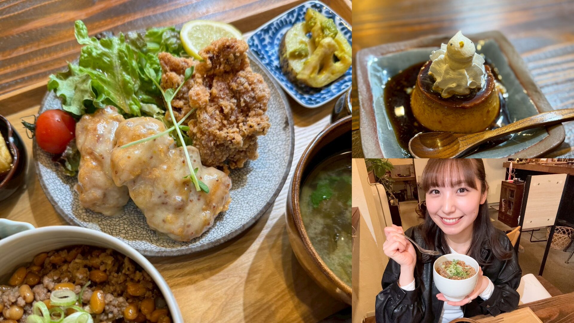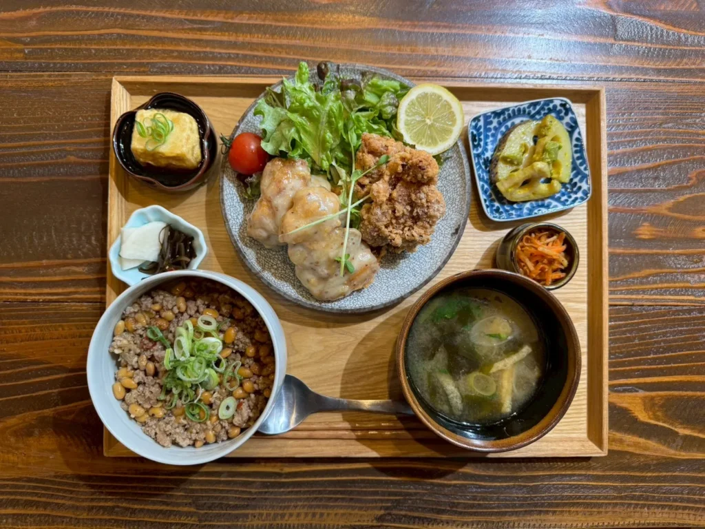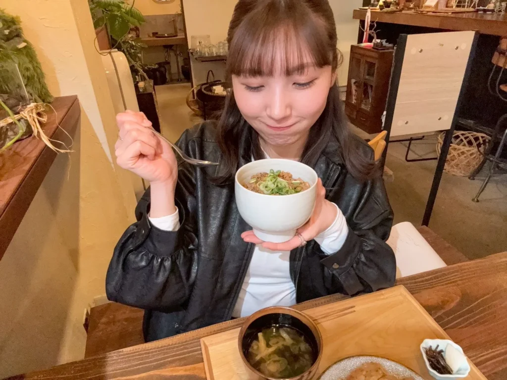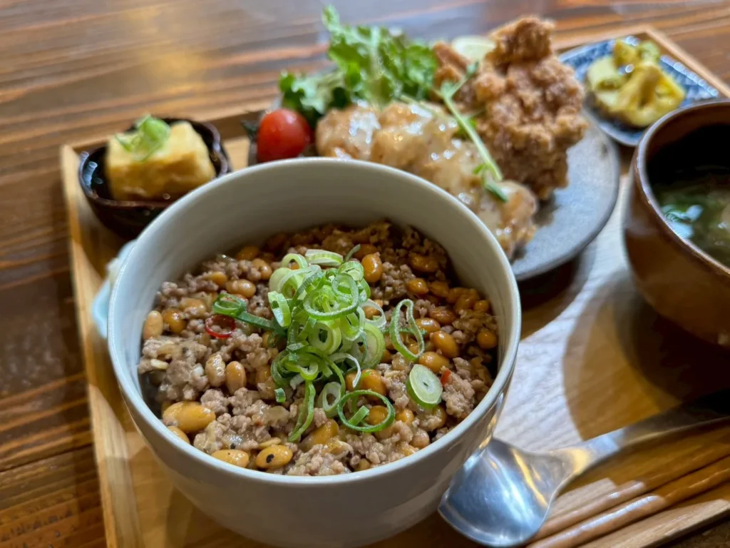 定食にセットのご飯は、プラス350円で納豆そぼろ丼や親子丼に変更することができますよ!今回はおすすめの納豆そぼろ丼をいただきました〜♪