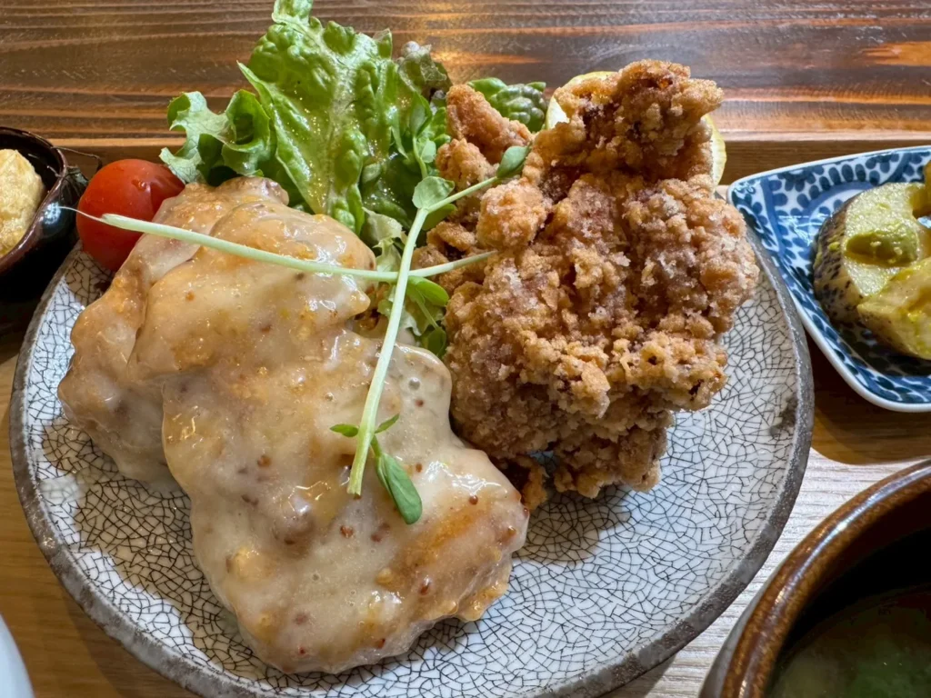 定番メニューの中から、1番人気のとりマスタードとからあげどちらも楽しめる「ハーフ」の定食をいただきます!
