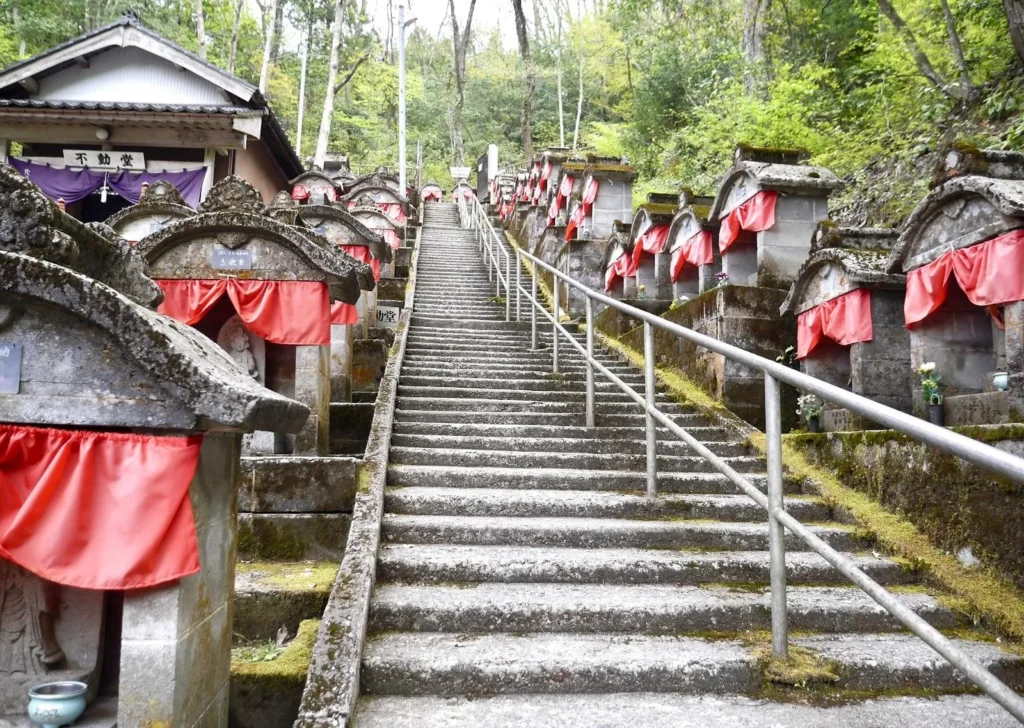 車を降りて緑に包まれた参道を進み、煩悩の数と同じ108段の石段を下りた先に、薬師観音堂が待っています。お堂のすぐそばにある洞窟から絶え間なく湧き出す水は、環境省の「名水百選」にも選ばれた至宝です。