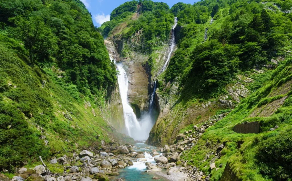 日本一の落差を誇る称名滝は、立山町が誇る大自然の傑作です。約350メートルの高さから4段に分かれて流れ落ちる姿は、言葉を失うほどの迫力に満ちています。雄山から届く清らかな水が、長い年月をかけて深いV字の渓谷を創り上げました。