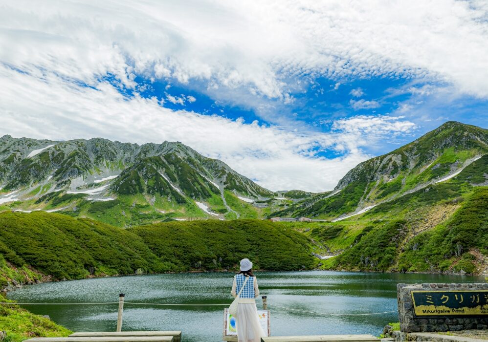 標高約2,450メートルの室堂に位置する「みくりが池」は、北アルプスでもっとも美しいといわれる火山湖です。室堂ターミナルから続く遊歩道はきれいに整えられており、心地よい風を感じながら歩けます。