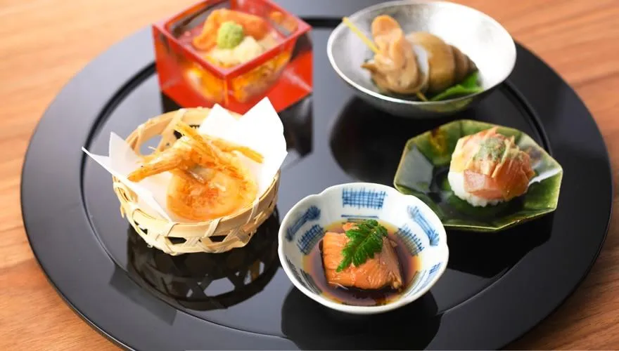 ランチタイムの人気は、5〜6種類の新鮮なネタを堪能できる「刺身定食」です。また、お祝いや自分へのご褒美には、海の幸・山の幸がぎゅっと詰まった予約制の「宝づくし御膳」や、料理長が旬の味を厳選したランチコースもおすすめ。前菜やお造りなど、一皿ごとに富山の豊かさを感じられる内容です。