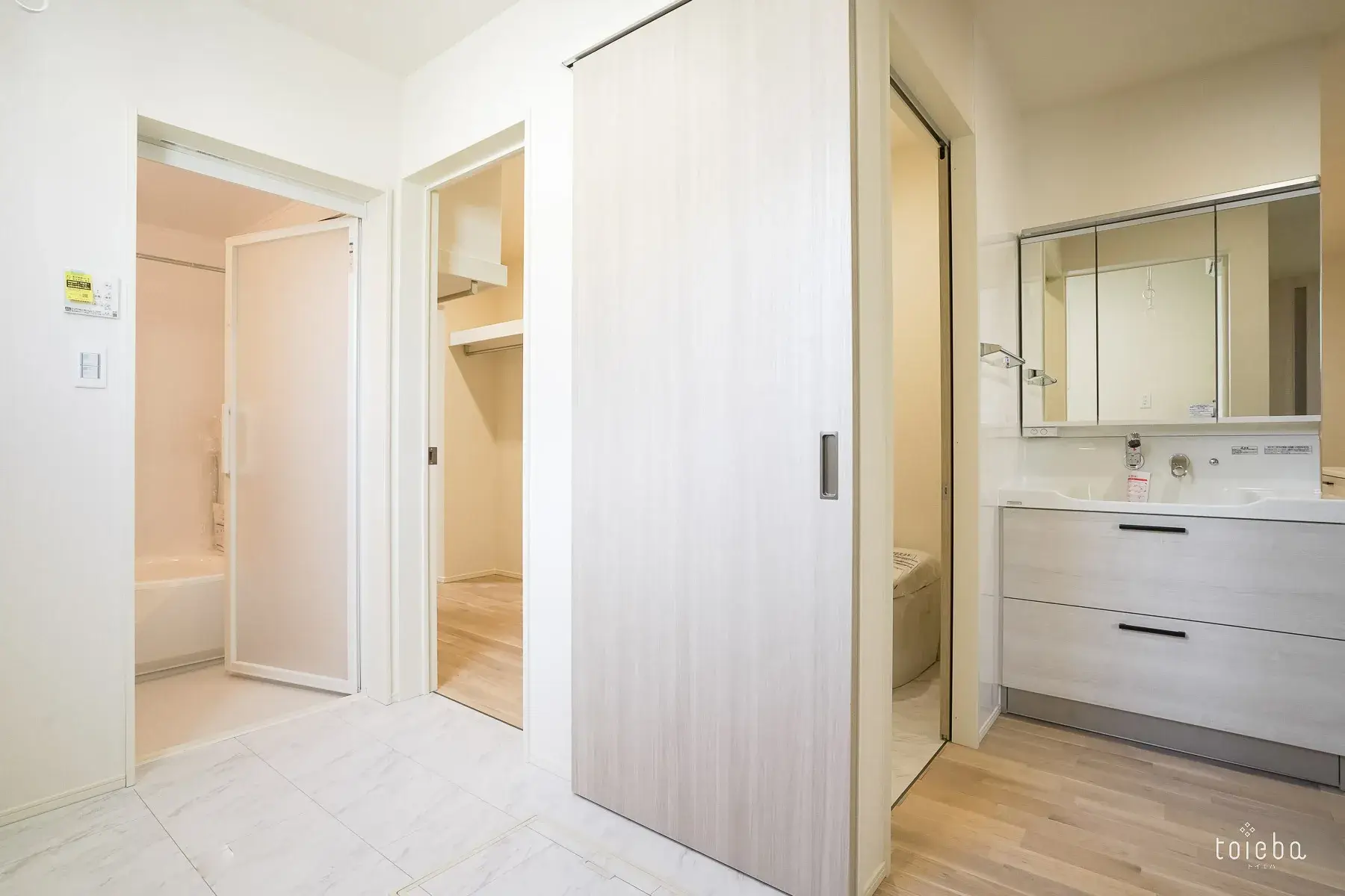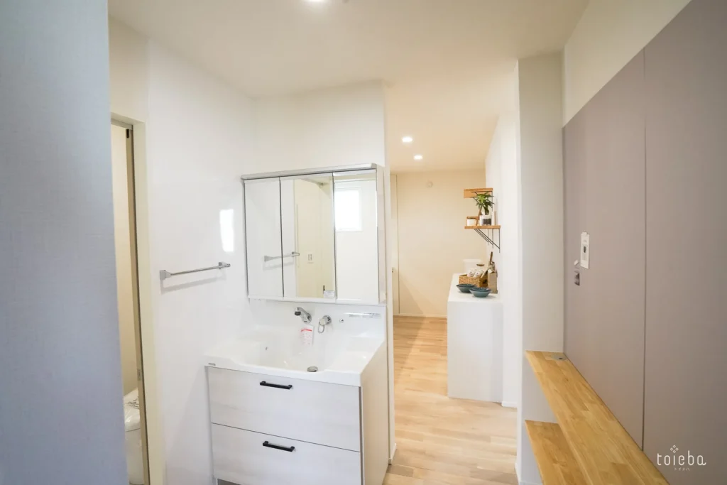 まず、玄関からLDKへと向かう動線上に洗面所を配置しています。帰宅してすぐに、迷うことなく手洗い・うがいができる「手洗い習慣」が自然に身につく設計です。