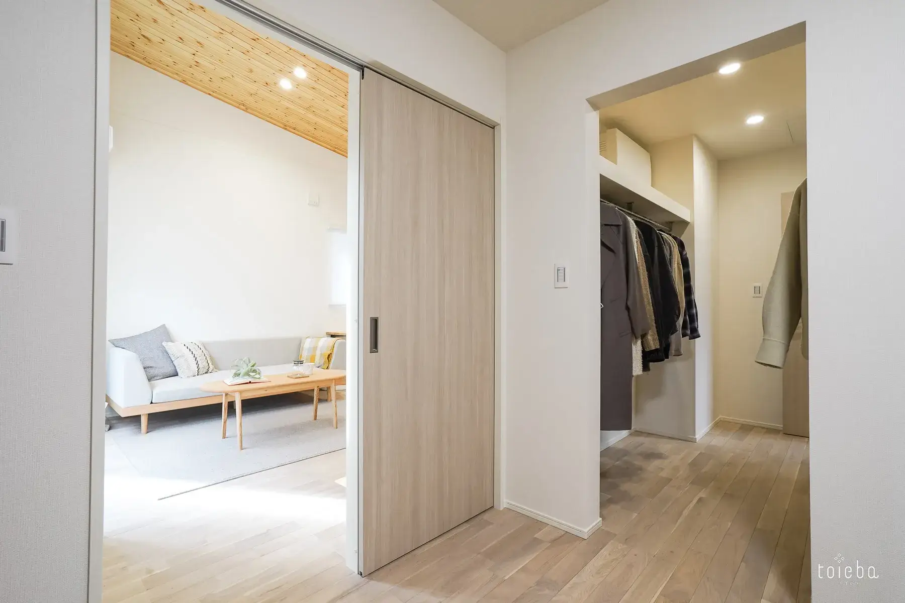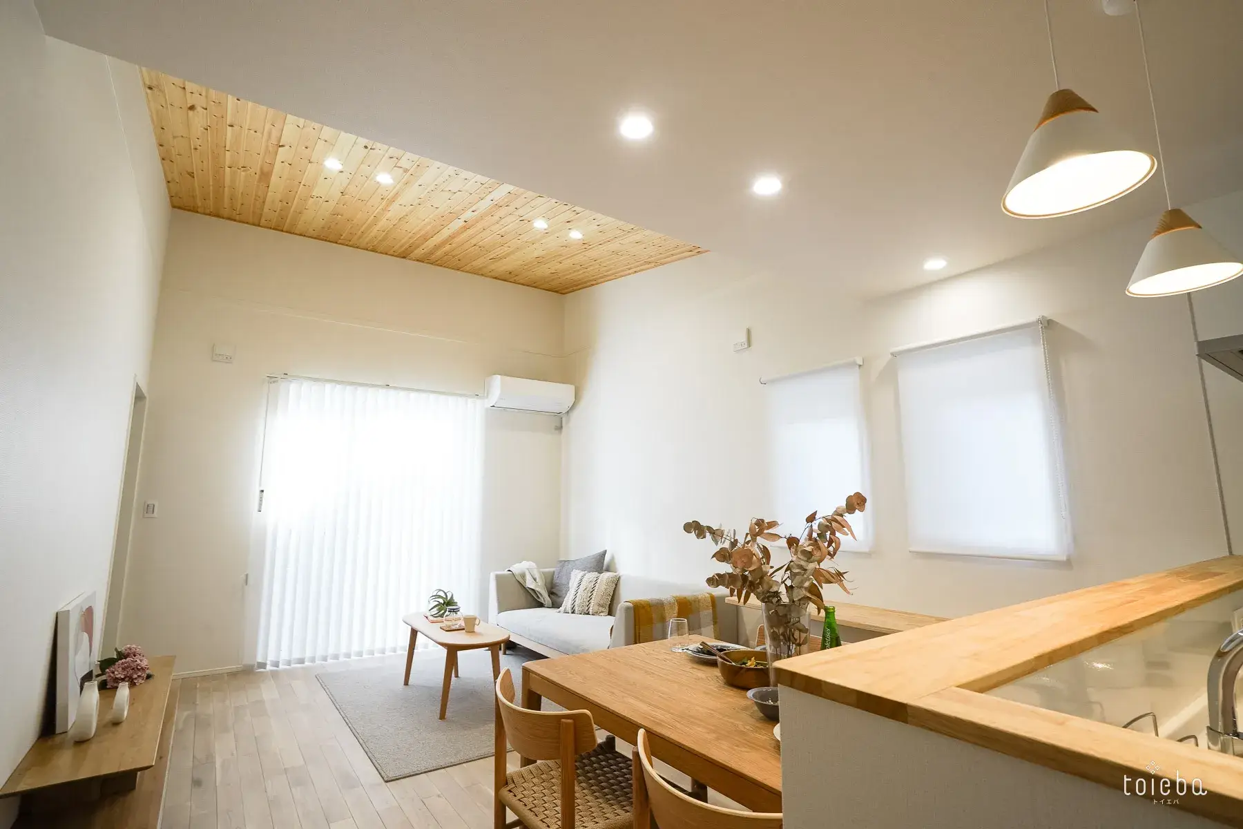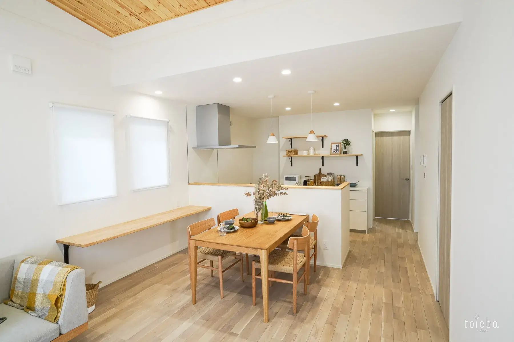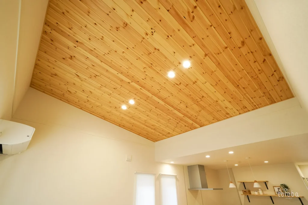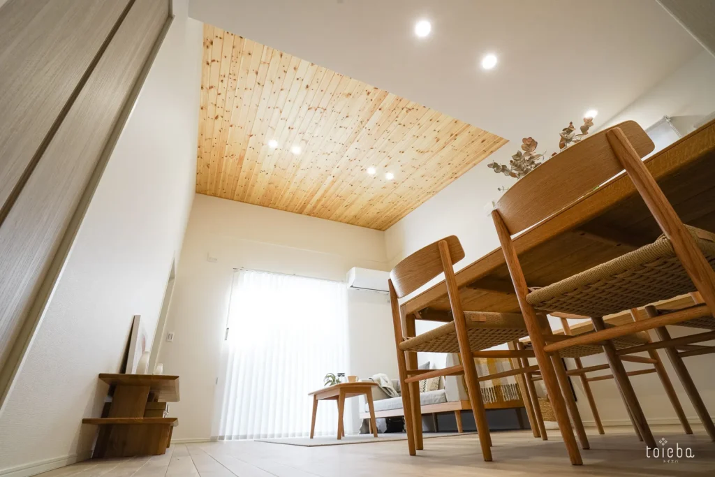リビングの天井は一段階高く、美しい羽目板張り。白い壁と、木の温もりを感じる無垢材のコントラストが、日常に安らぎを与えてくれます。