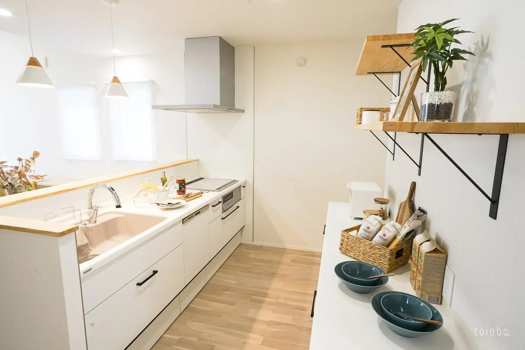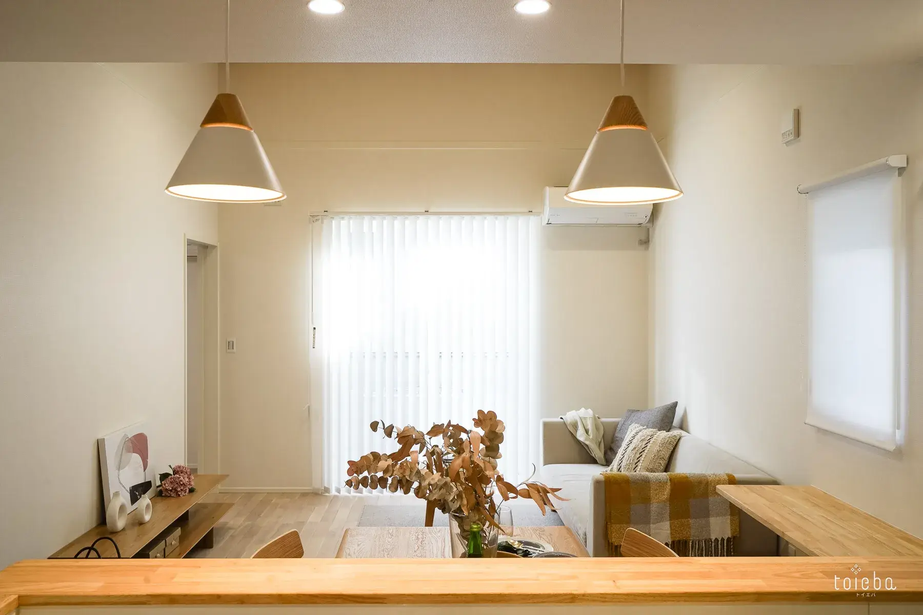 大きな窓から差し込む自然光と計算された照明が部屋全体を包み込み、家族が自然と集まりたくなる場所になっています。窓際には作業スペースに使える長いカウンターもあります。
