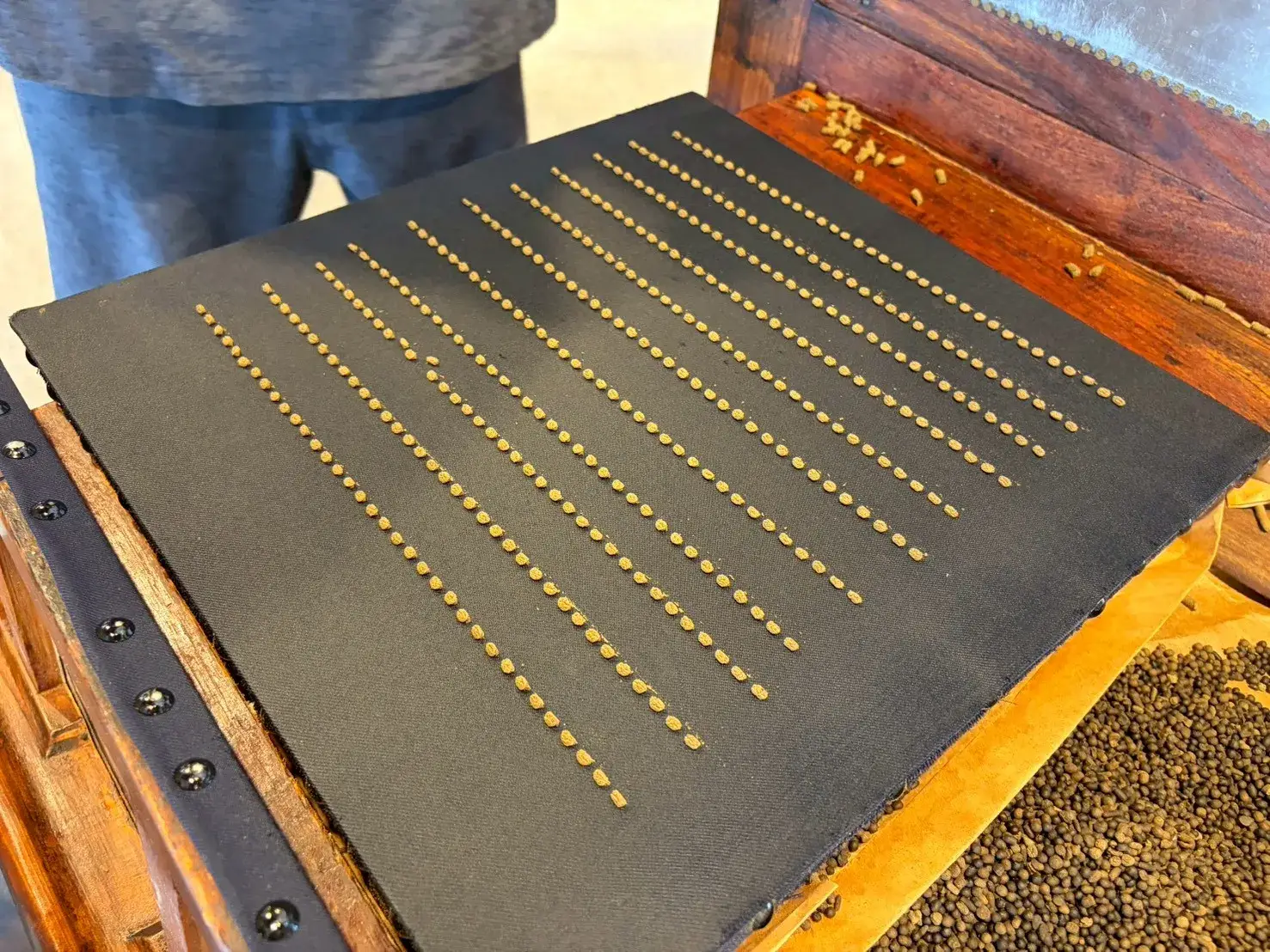 手動式製丸機を使って、丸薬を作ります!粘土状の薬を切って並べ、板と板を擦り合わせると…均一な丸状の薬が出来上がります。