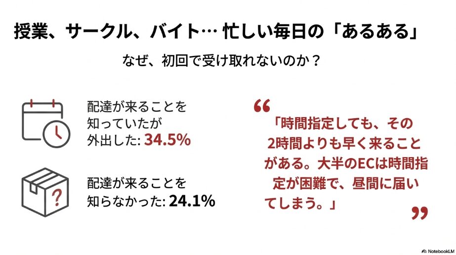 などなど、忙しい大学生は荷物を受け取れるタイミングが少なく、再配達になるケースがありますよね。