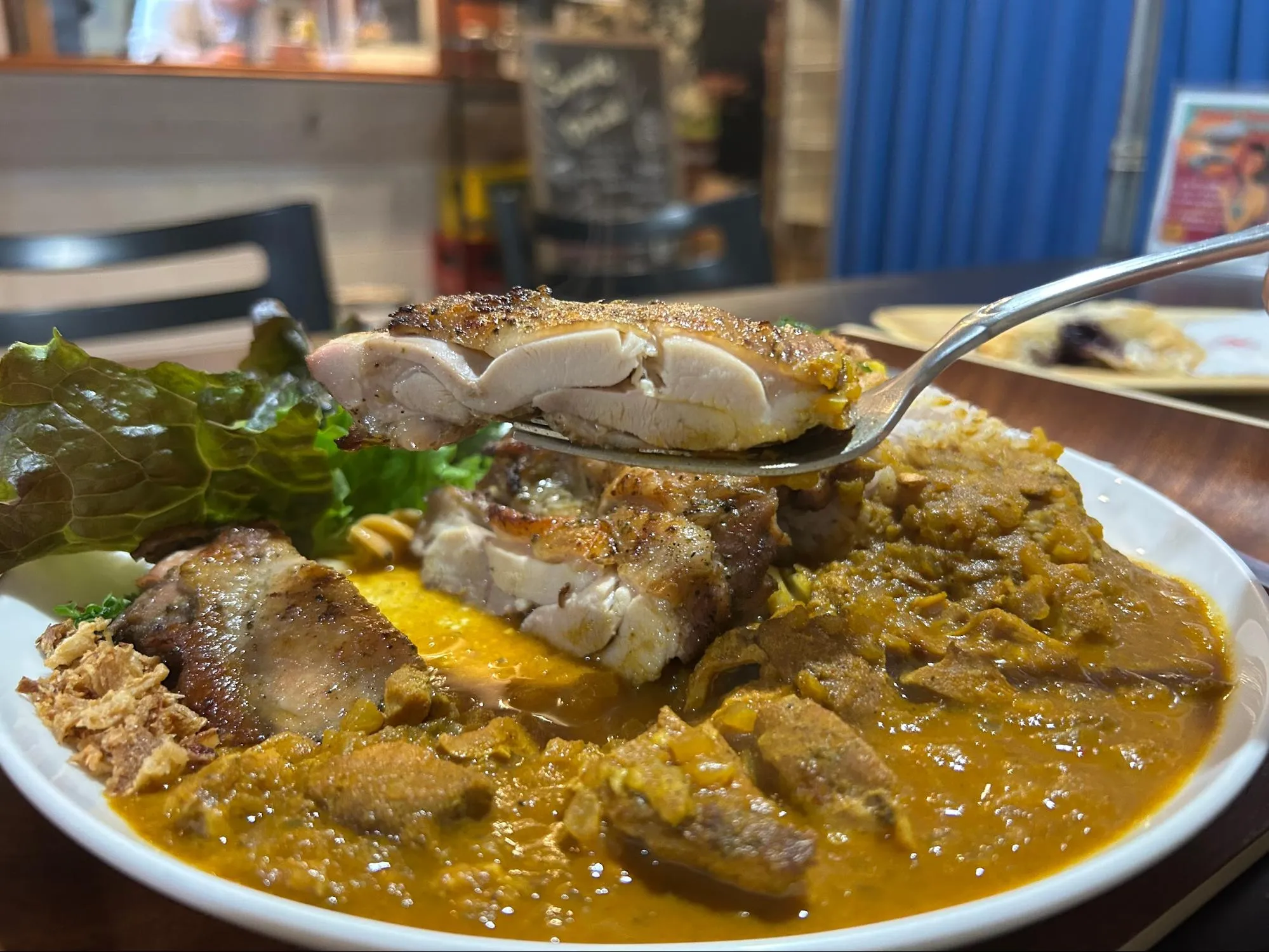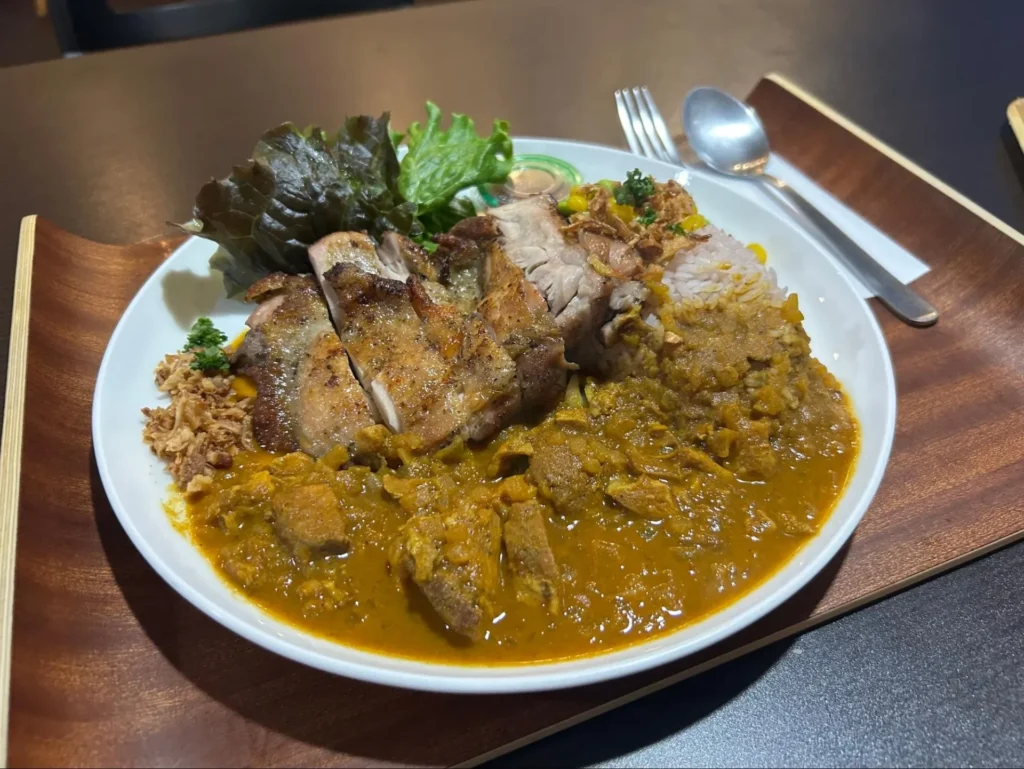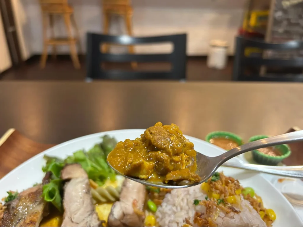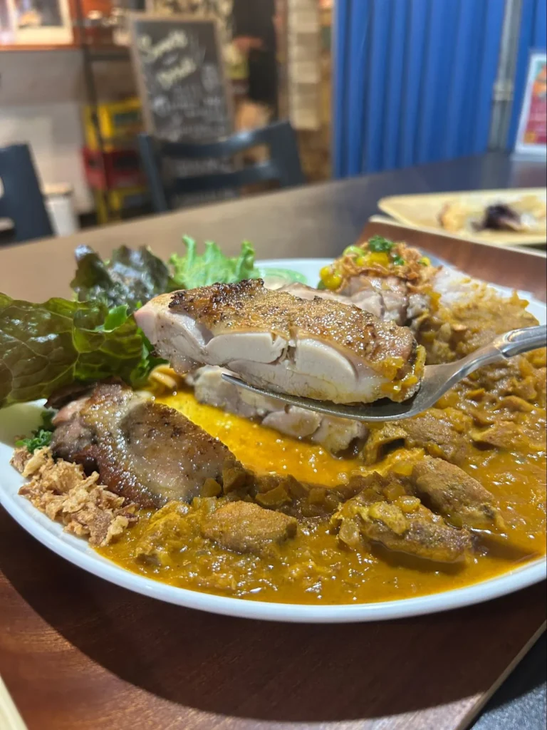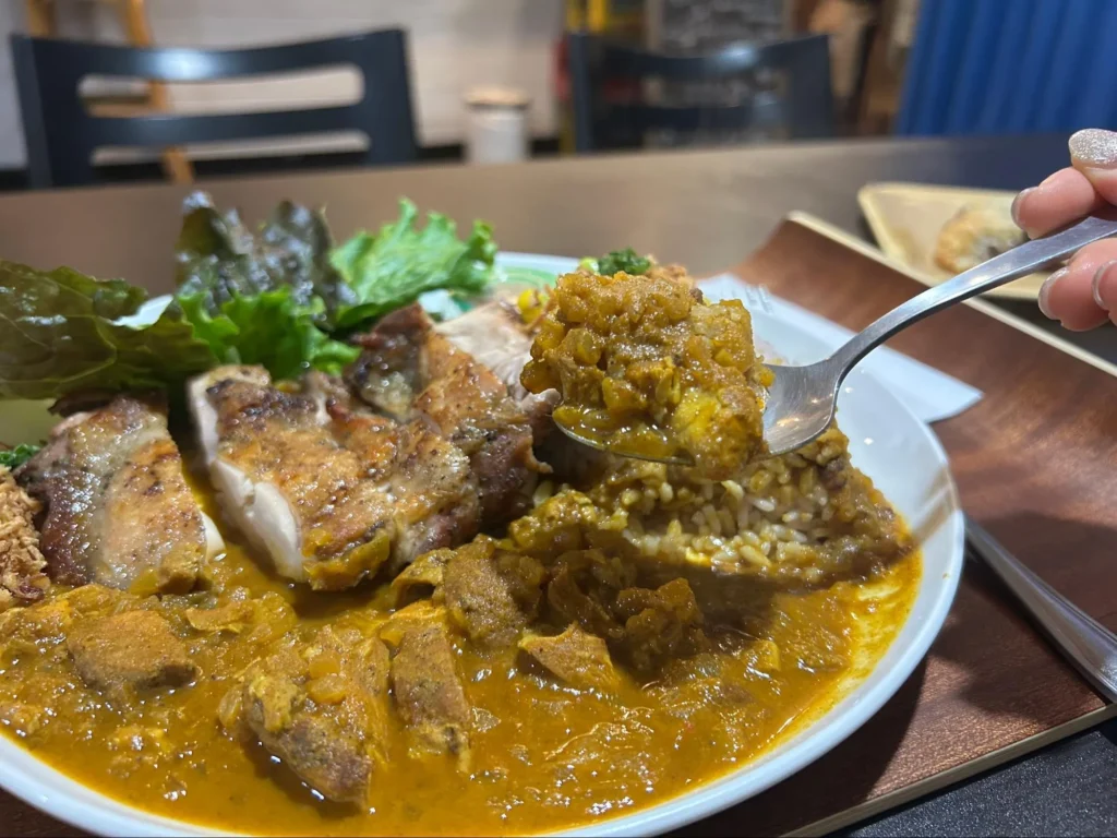 ジャマイカンカレーはピリッと辛く、食べていると体がぽかぽか温まってきます。カレーにもたっぷりのジャークチキンが入っており、カレーの旨味がしっかり染みた味わいに。