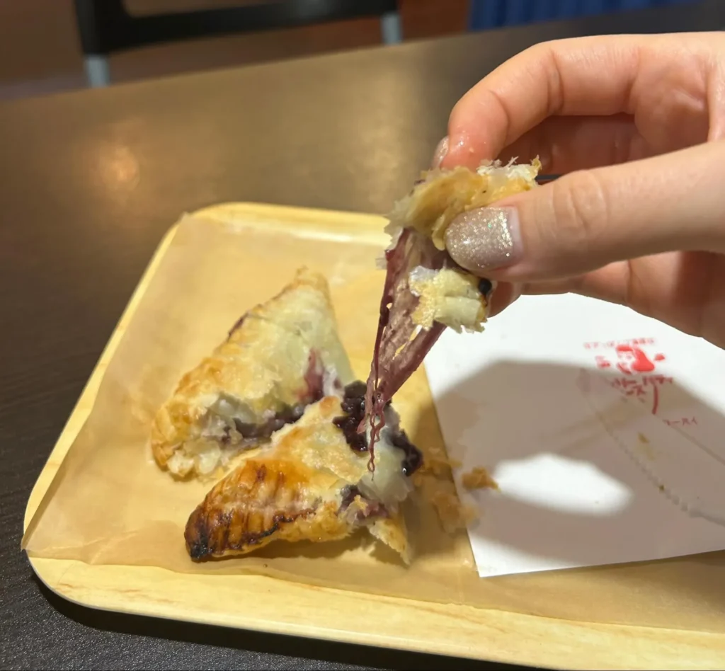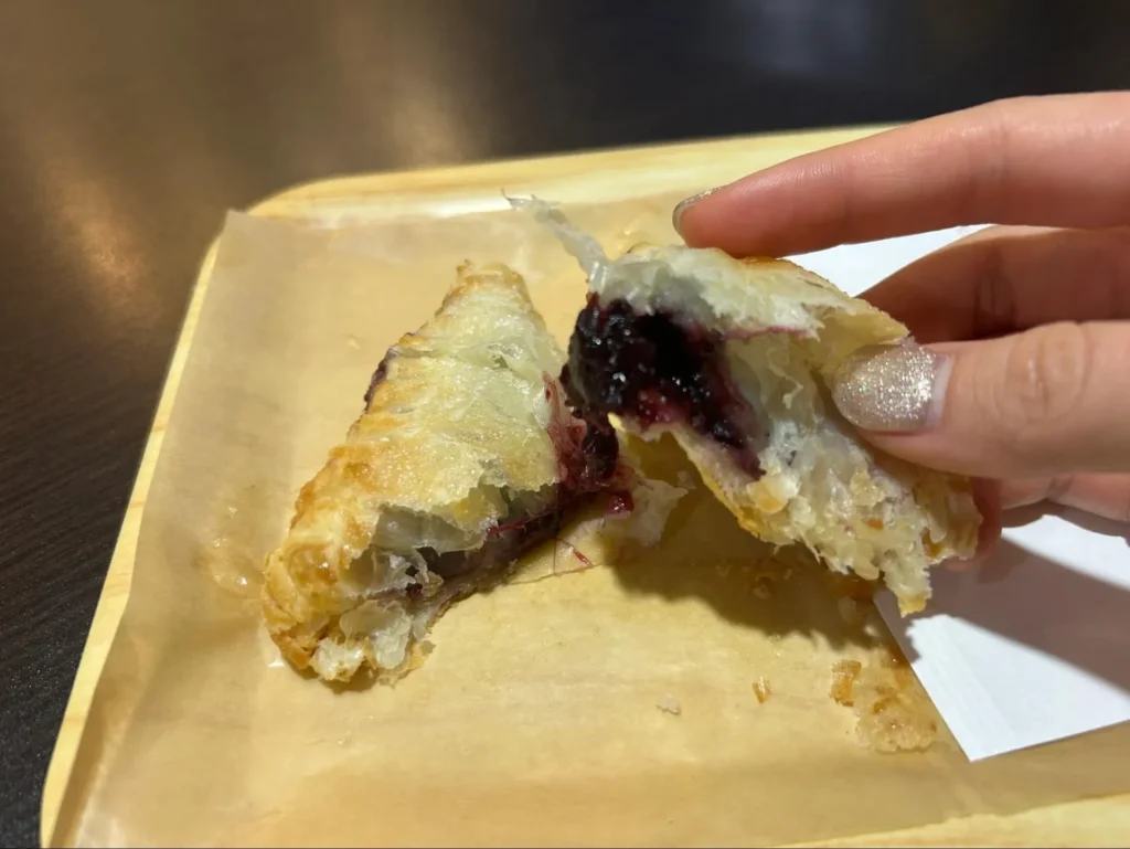 生地はサクッとしていて、中からとろっとしたベリーソースとたっぷりのチーズが溢れ出てきます。チェリーパティは温かいうちに食べるのがおすすめ。チーズが伸びるのでどこまで伸びるか試してみてくださいね。