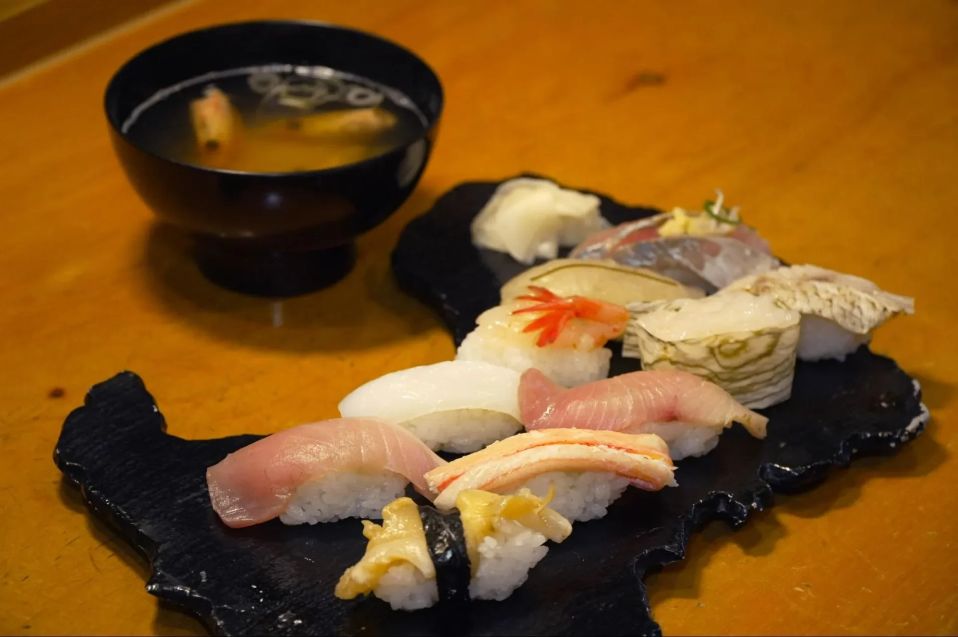 下段左から バイ貝、ベニズワイガニ、ブリ、白えび軍艦、ノドグロの炙り