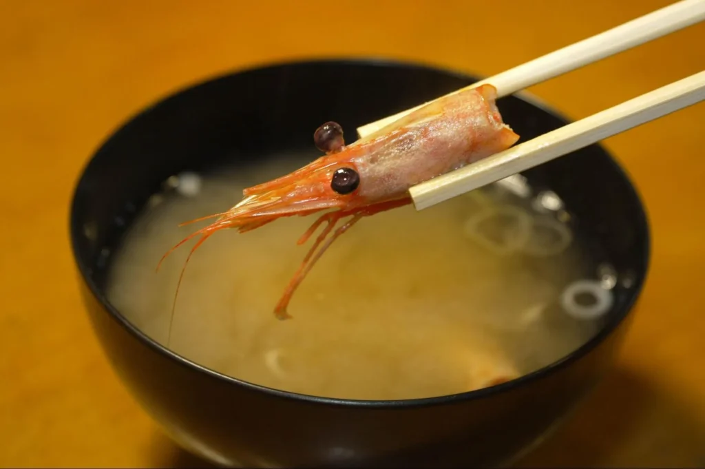 セットに付く味噌汁は日替わりで、魚のアラを使って仕上げています。この日は甘エビの頭が入った、見た目にも贅沢な味噌汁で心が安らぐ味わいでした。