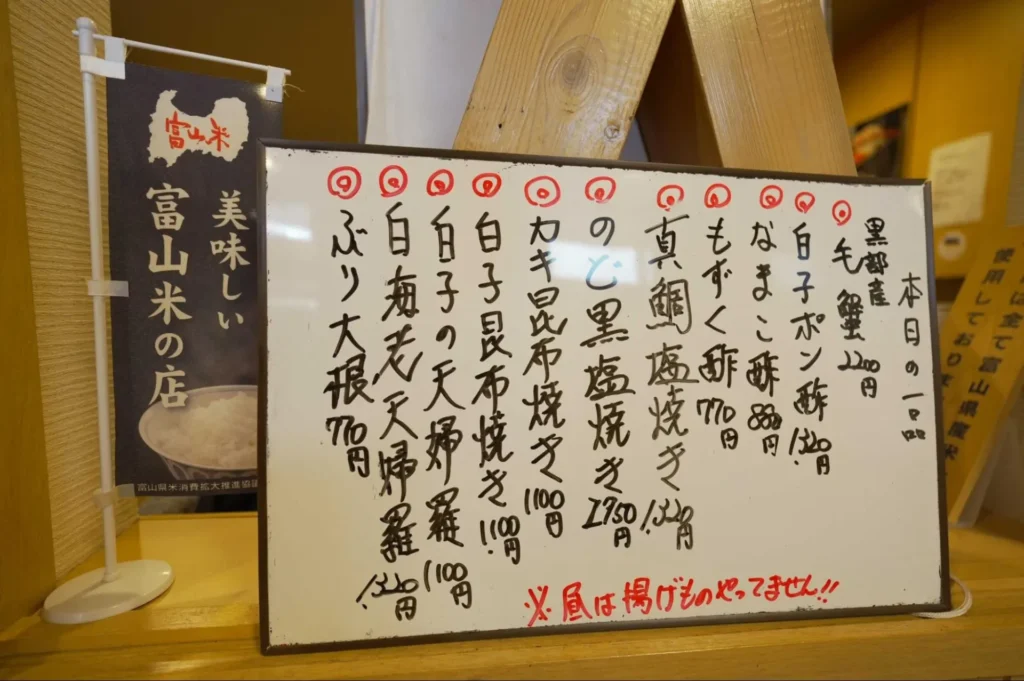 お寿司の旨さはもちろん、割烹で修行した店主の天婦羅や焼き物もおいしく、その日のおすすめはホワイトボードに記されています。