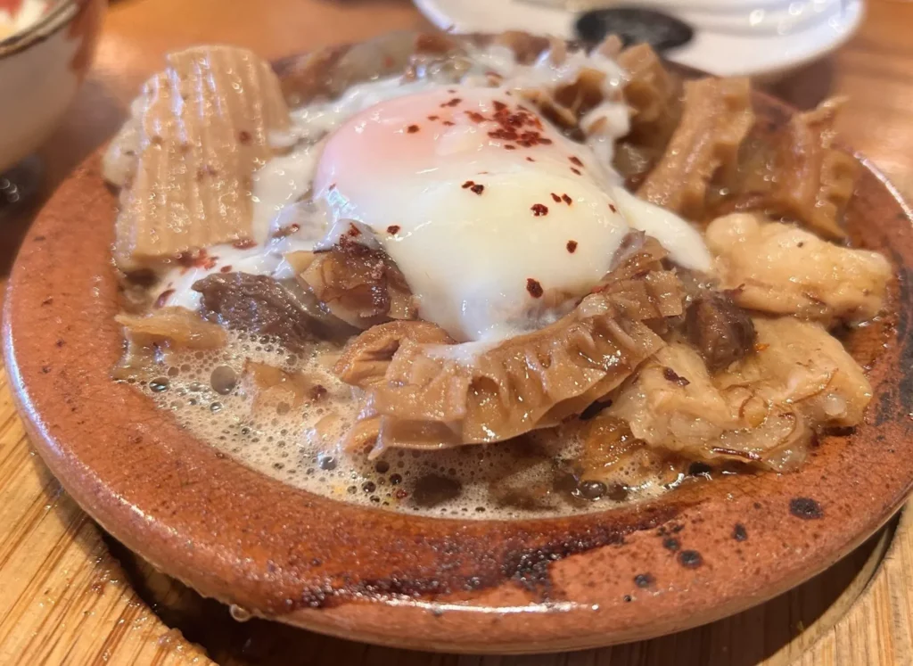 オープン以来、毎日継ぎ足されるタレで煮込まれる看板メニューの「牛トロ煮込み」もぜひ食べたい一品。メニュー表には今日で何日目か記されており、味わい深さを感じられます。