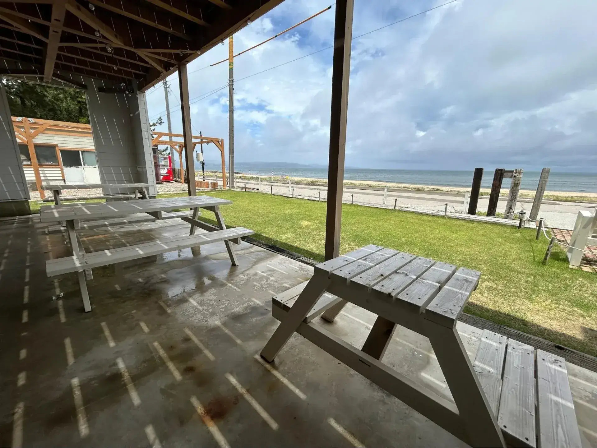 魚津市の海岸沿い、しんきろうロードを走っていると見えてくるのが「+met」です。キッチンカーで注文を済ませ、2階のデッキやテラス席へ上がれば、目の前には富山湾の大パノラマが広がります。夏から秋にかけての期間は、夜の海を楽しめる夜営業も行われます。