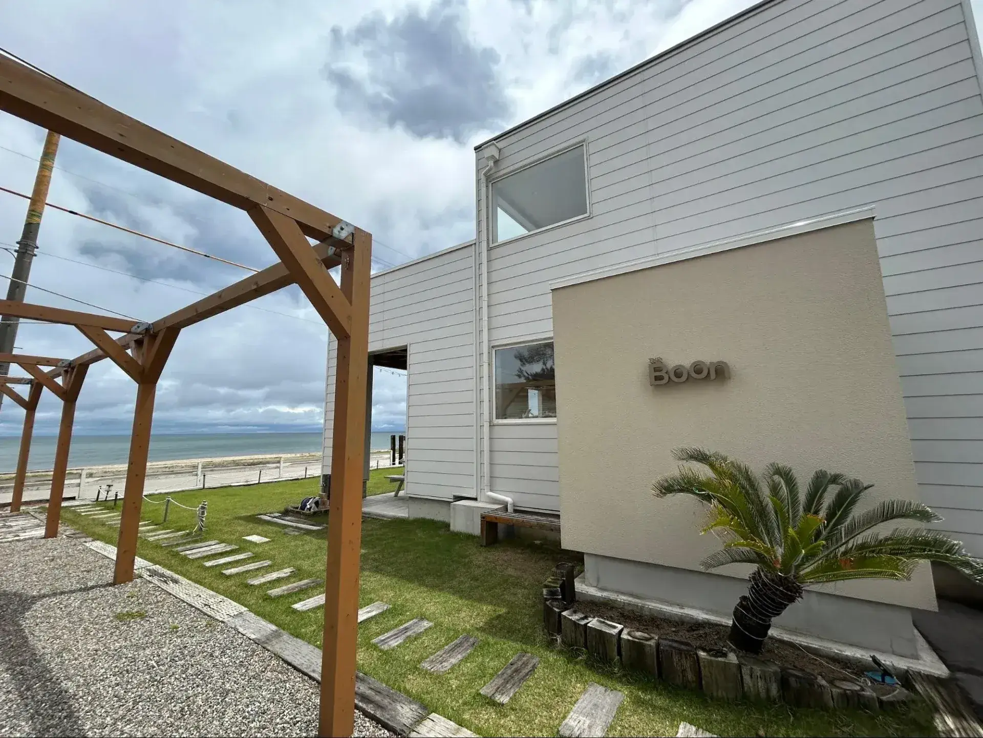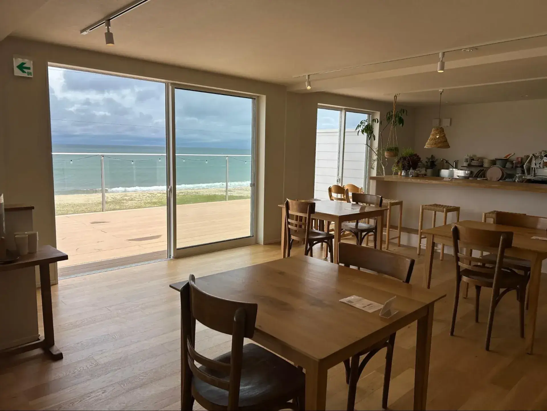 雨晴海岸のすぐそば、波音を感じながらくつろげるカフェ「The Boon」。開店前から列ができるほどの人気店で、窓一面に広がるオーシャンビューが最大の魅力です。