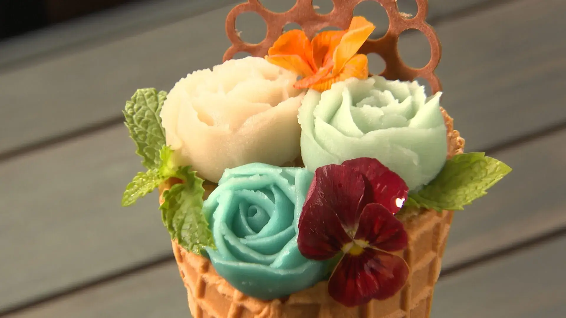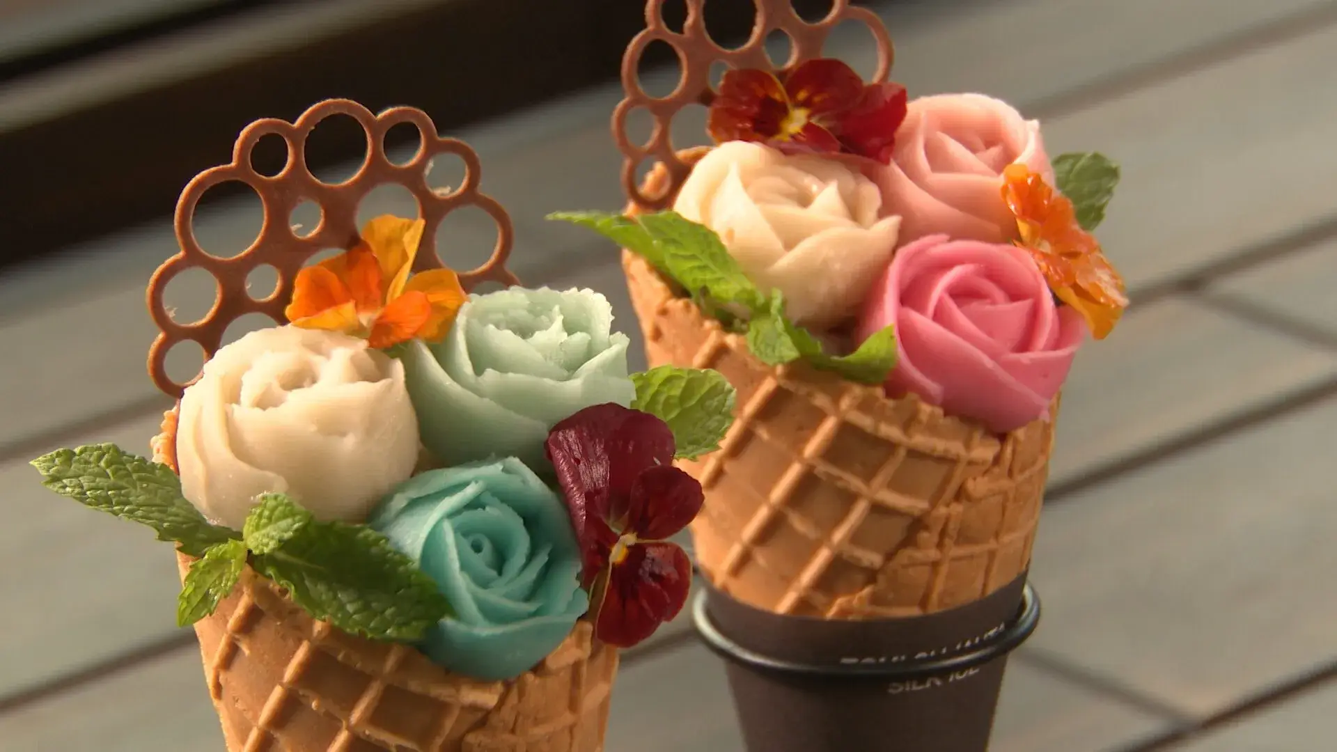 お店の人気メニューは、まるで芸術作品のような「ブーケソフト」。ソフトクリームの上に色鮮やかなお花が咲き誇る姿は、思わず食べるのをためらってしまう美しさです。カラフルなバラはあんこで作られており、食用花との組み合わせは目でも舌でも楽しめます。