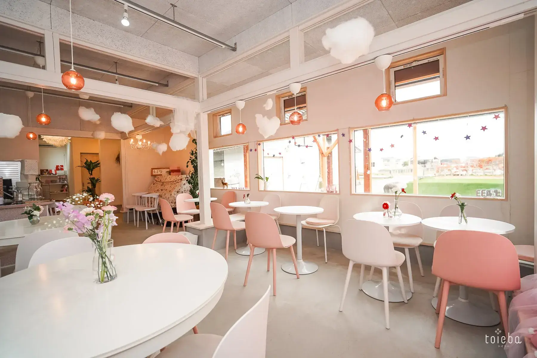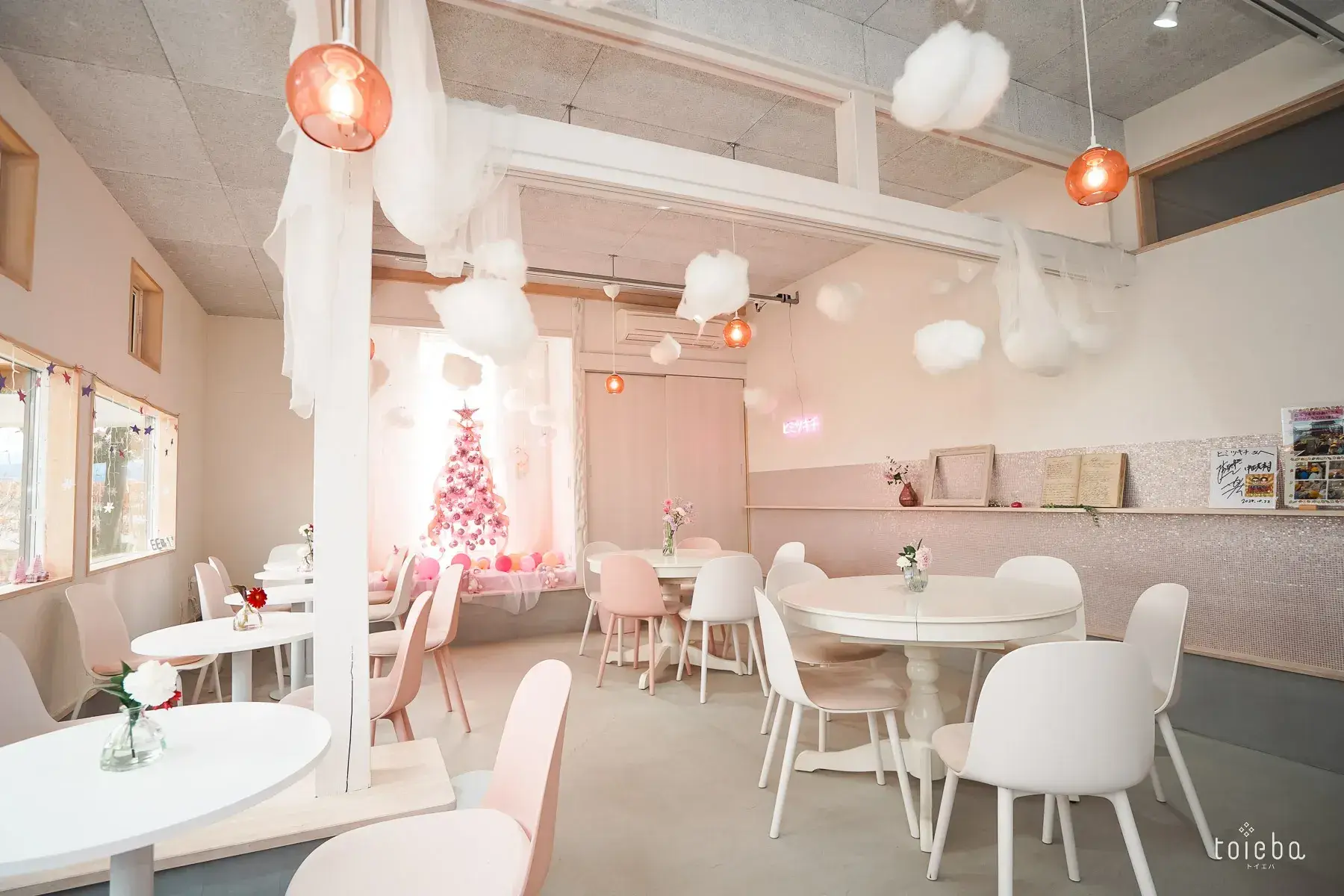天井には雲のようなふわふわとした飾りが広がり、白とピンクを基調としたインテリアが乙女心をくすぐります。店内のどこを切り取ってもフォトジェニックで、まるで絵本の世界に迷い込んだかのようなインスタ映え空間が魅力です。