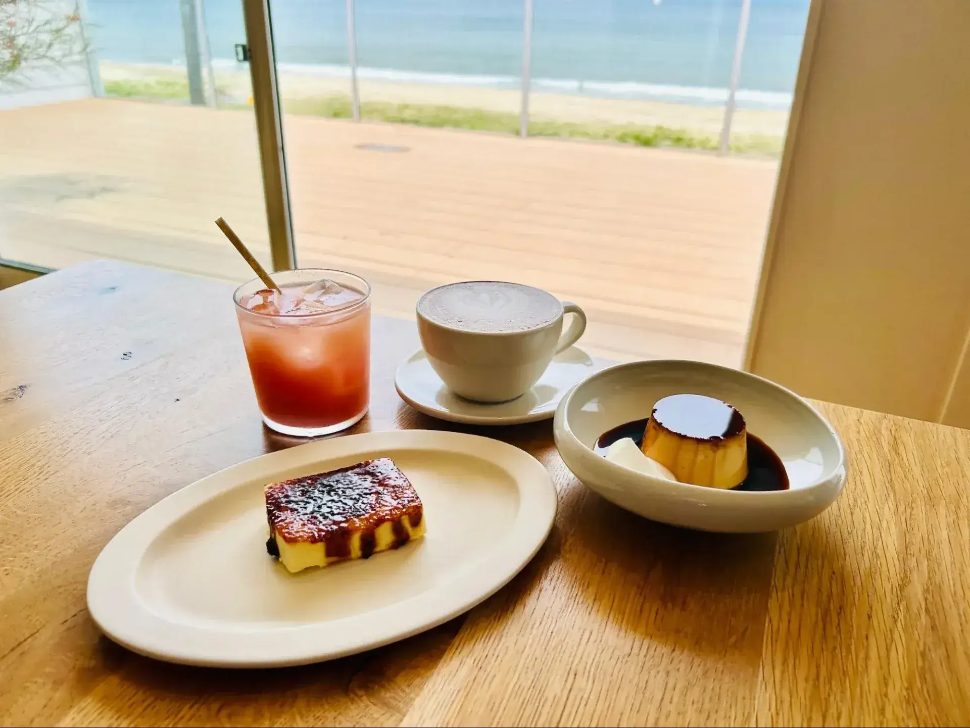 こちらのカフェで味わえるスイーツは、表面をパリパリに焼き上げた「半生チーズテリーヌ」や、ほろ苦いカラメルが大人な味わいの「ダークキャラメルプリン」など、丁寧な手仕事が光ります。繊細なラテアートが施されたホットラテを片手に海を眺めれば、至福のひとときを過ごせるでしょう。