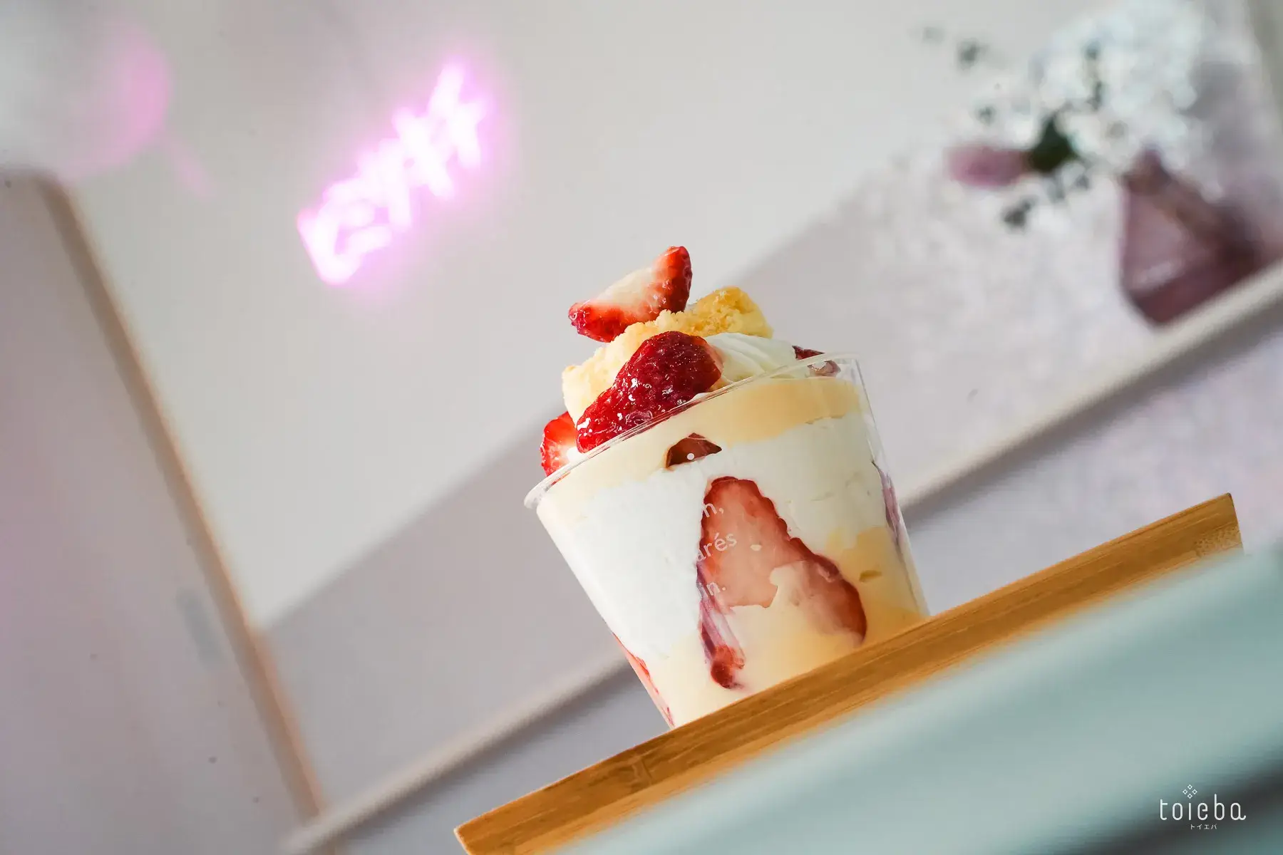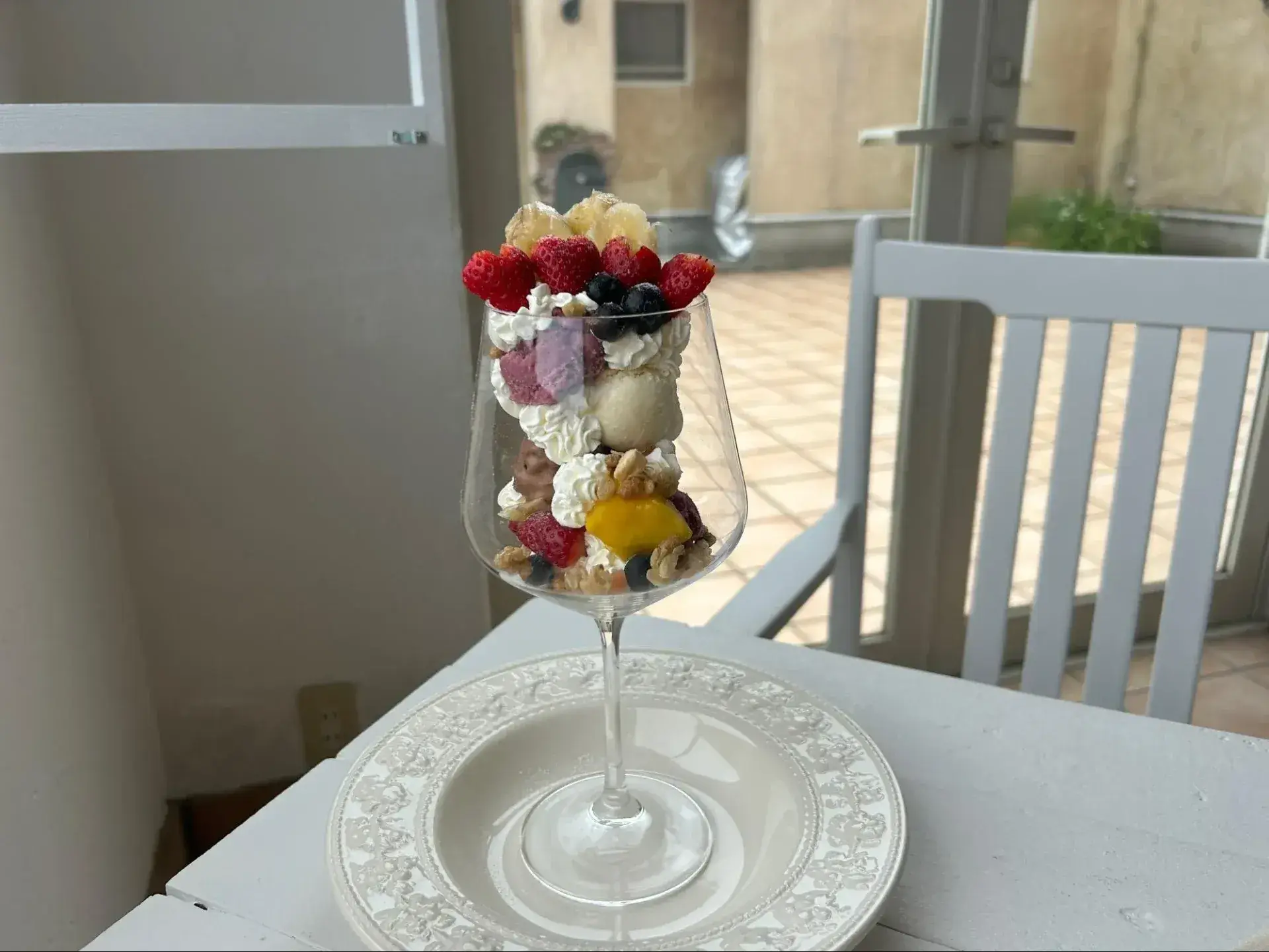 午後のひとときには、ワイングラスに盛り付けられた優雅なアサイーパフェがおすすめです。フルーツの爽やかな酸味とアイスの甘みが溶け合う味わいは、大人のデザートタイムにぴったり。
