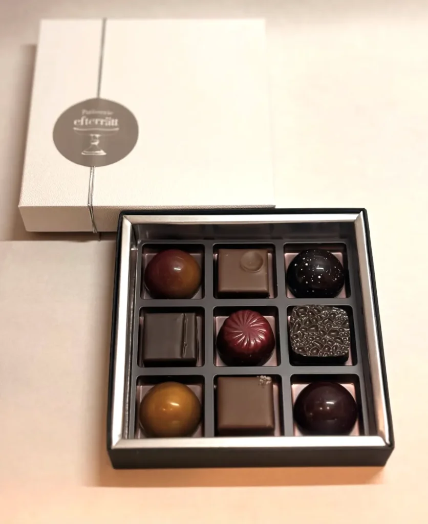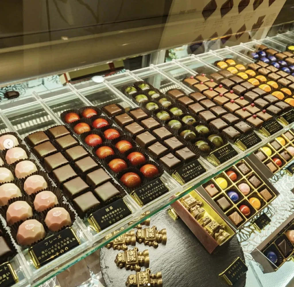 店内にある専用のショーケースには、カカオの深い香りとともに、フルーツやキャラメルと調和した美しいチョコレートが並んでいます。カカオの苦味を活かした重厚なものから、ミルクやフルーツの優しさが際立つものまで、見ているだけで幸せな気持ちにさせてくれるでしょう。