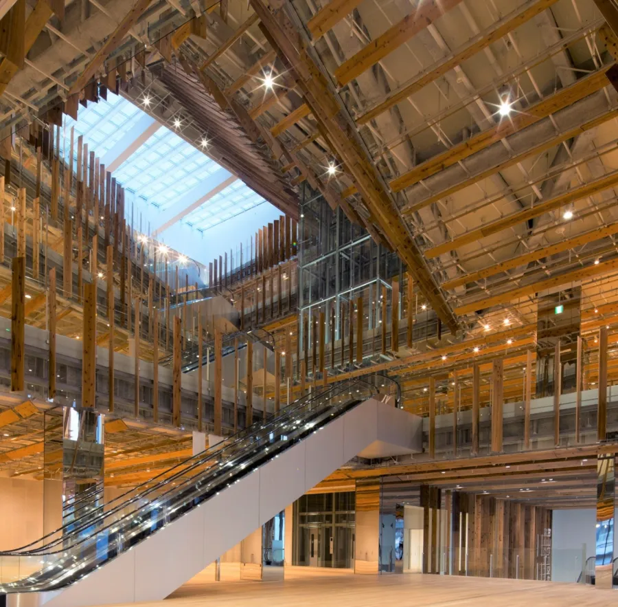建物に一歩足を踏み入れると、外観のクールな印象とは対照的に、木の温もりに包まれた大空間が広がっているのが特徴です。天井まで続く開放的な吹き抜けには、富山県産の杉で作られたルーバー(細長い羽板を一定の間隔で平行に並べた建築部材)が贅沢に使われています。