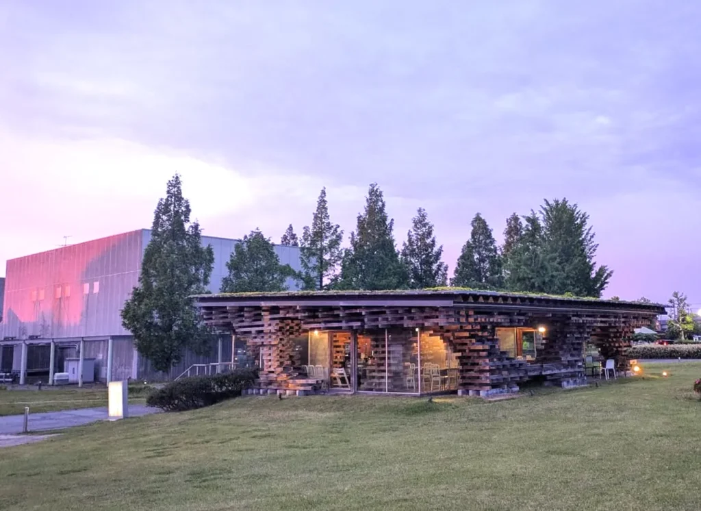 富山市舞台芸術パークの緑豊かな敷地内に、まるで積み木を重ねたような独創的な建物がたたずんでいます。「カフェ・クレオン」は、木を組むのではなく「積む」という発想から生まれた、森の一部のような建築です。