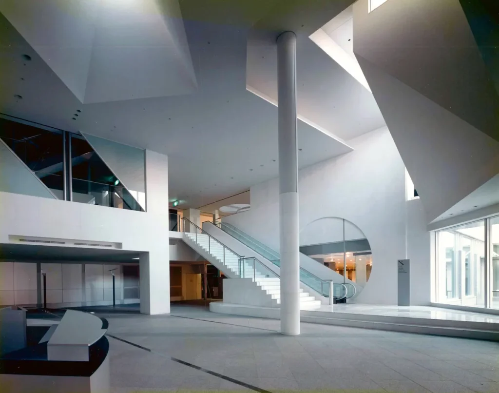 複雑に組み合わさった外観は、見る角度によって全く異なる表情を見せてくれるのが魅力です。公共施設としての役割を担いながらも、圧倒的な存在感を持っています。