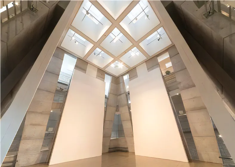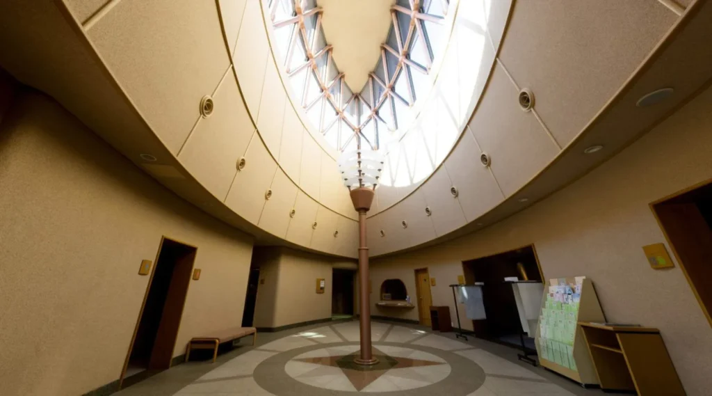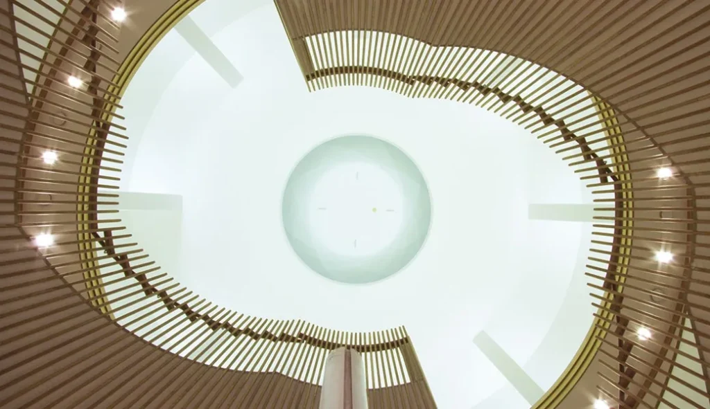 中へ入ると、建物全体を貫くような吹き抜け空間に目を奪われるでしょう。また、各階のバルコニーや回廊が大きなアトリウムを囲むように配置され、一体感のある設計になっているのが特徴です。