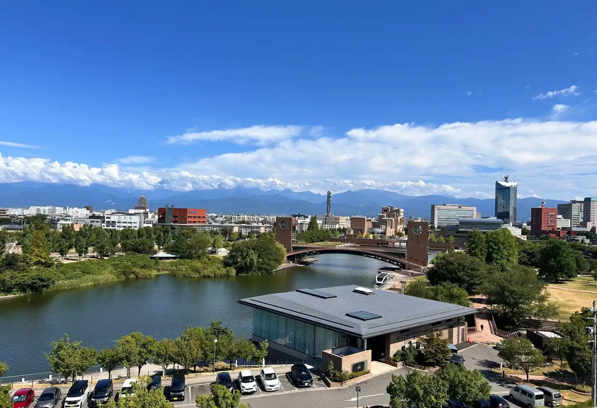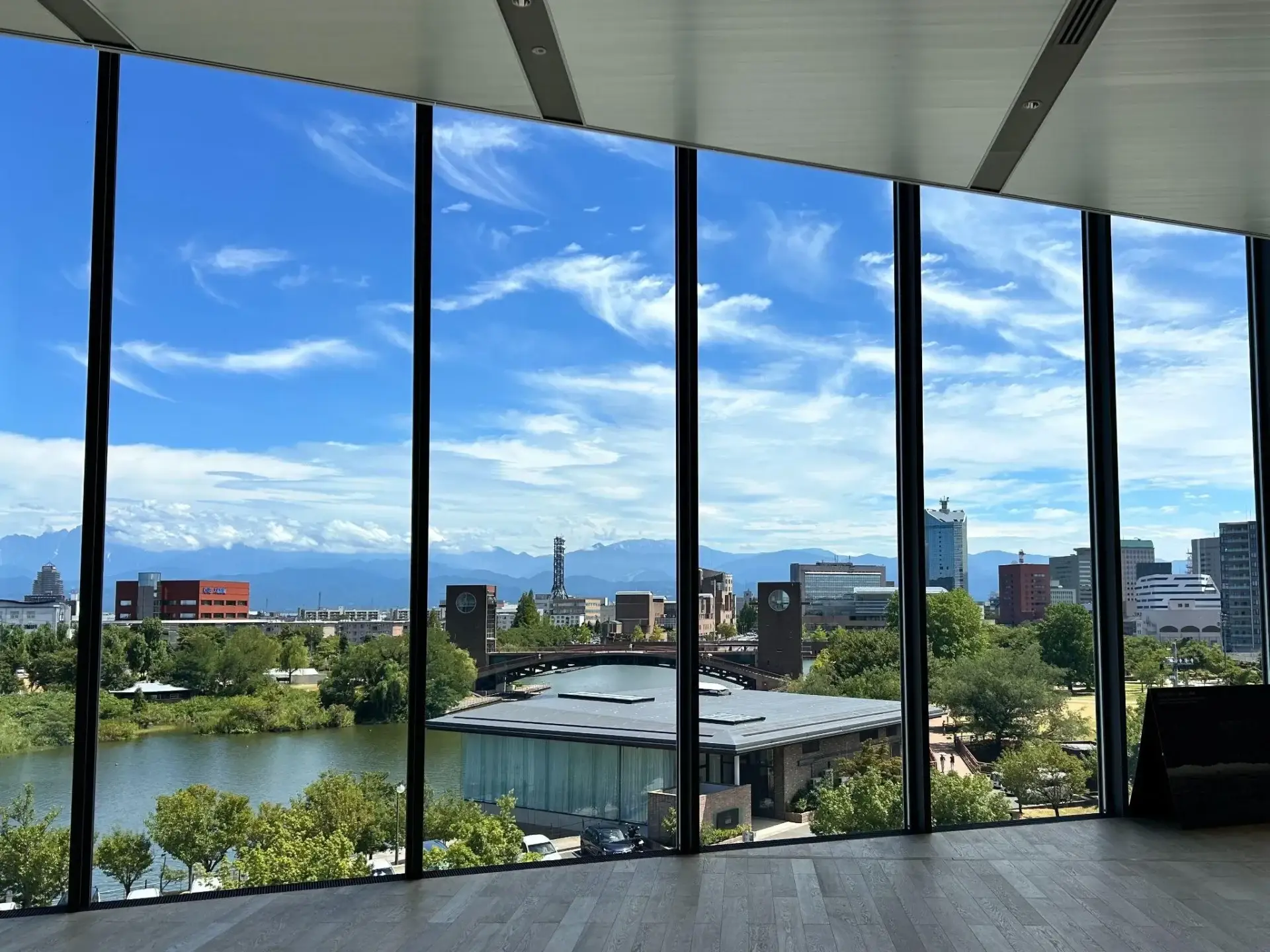 建物の壁は全面がガラス張りになっており、周囲の景色を美しく映し出しています。 館内からは、運河のきらめきとともに、遠くにそびえる立山連峰のパノラマを堪能できる建築としても知られています。