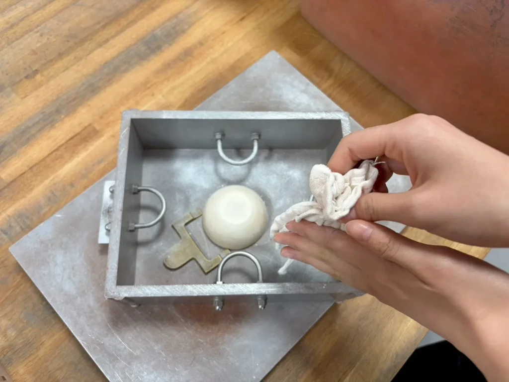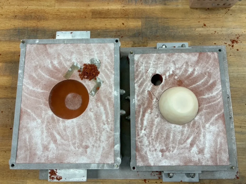 はみ出している鋳物砂をアルミの角棒で削ると…綺麗な表面になりました!器の外側の型取り完了です!