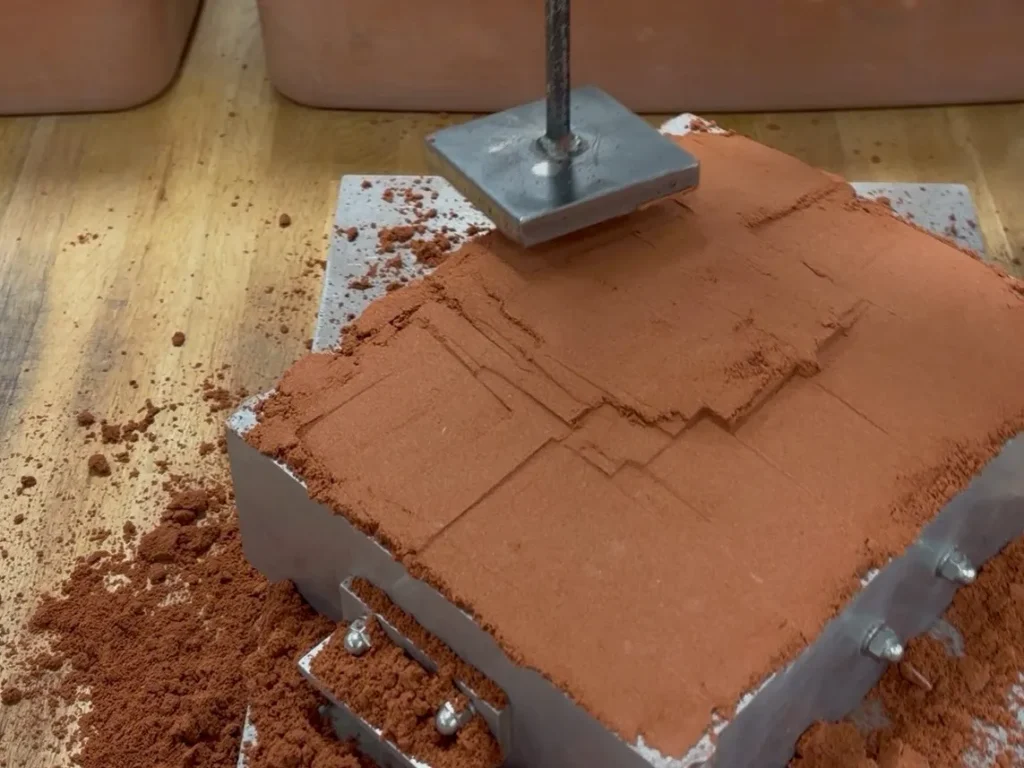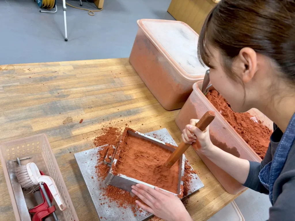 さらに鋳物砂を、ギュッギュッと押しながら入れ、今度はスタンプという道具を使ってまた叩きます!