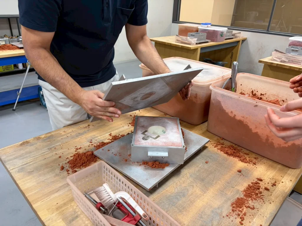 ハウチングパウダーをかけ、湯口棒という道具をセットし、鋳物砂を入れて固めていきます。